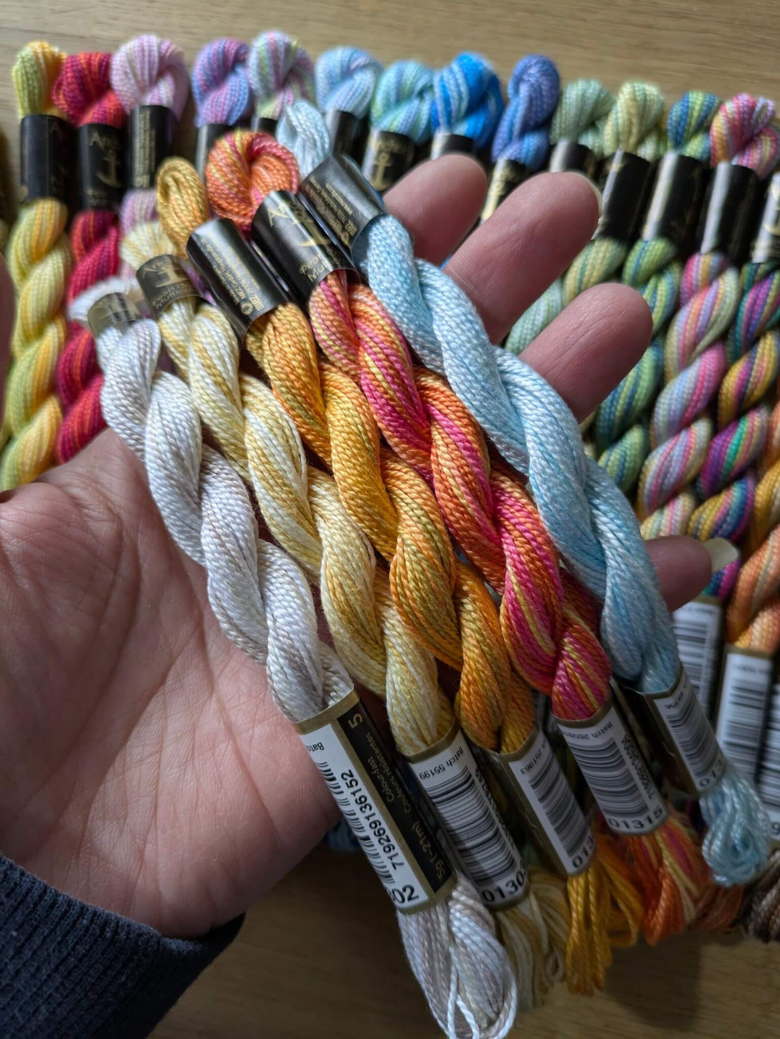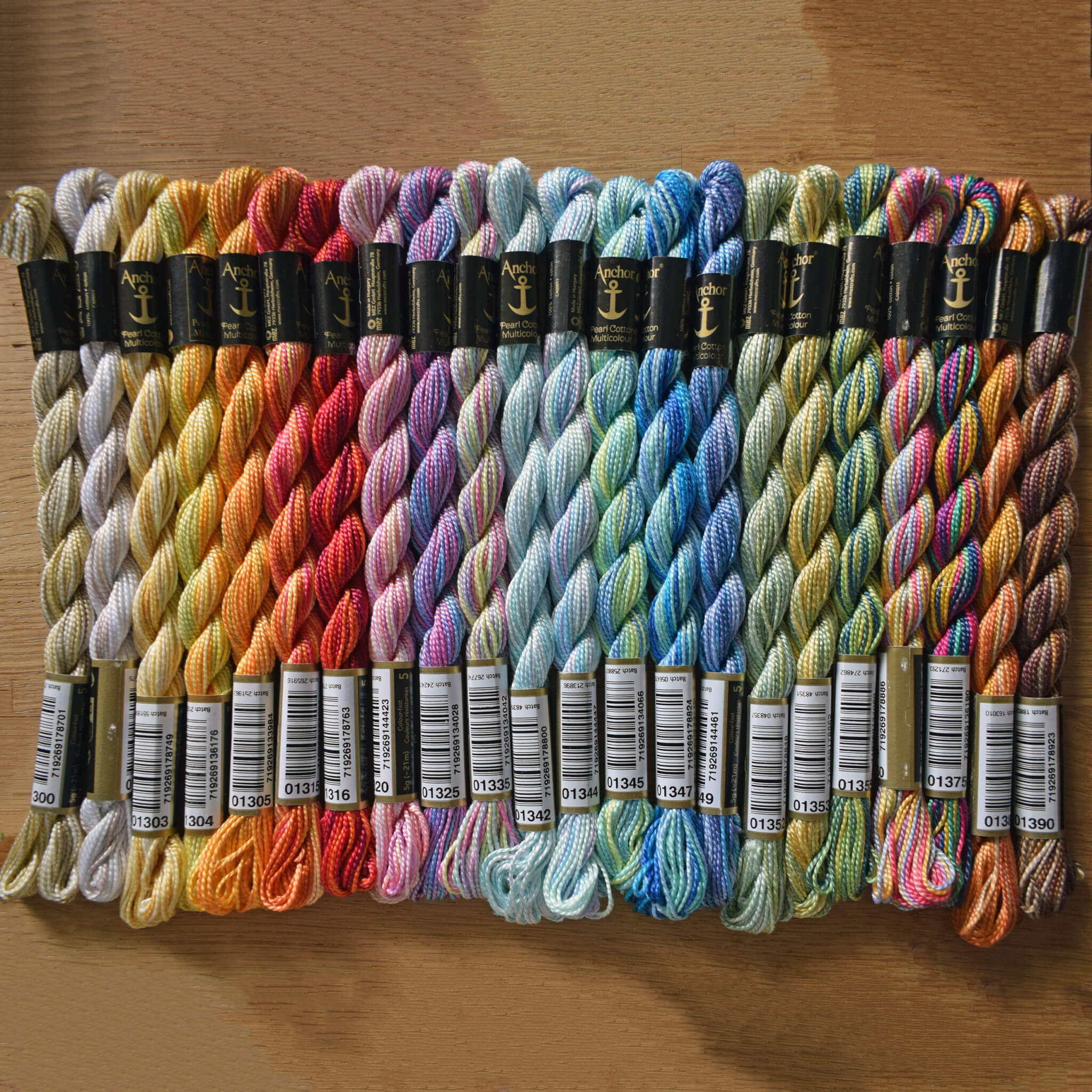 Each skein is 21 m long and sold individually, so you can pick just the shades you need. I currently stock 22 of the variegated colours; a few are now rare treasures since Anchor joined the DMC group and reduced the range. The following are available while stocks last: 01316, 01320, 01349, 01385 and 01390 — with 01349 only found now in my Dorset Button Kits.