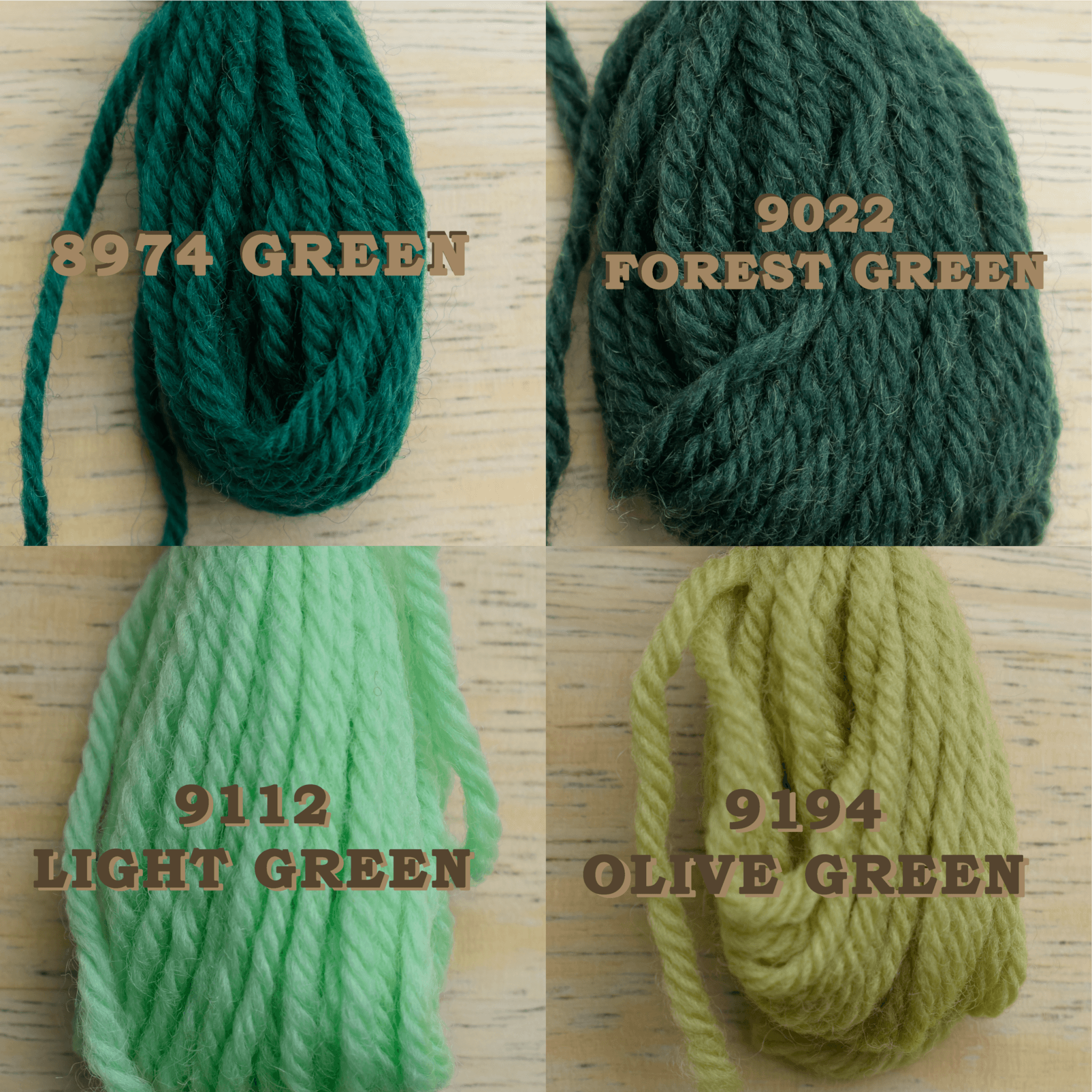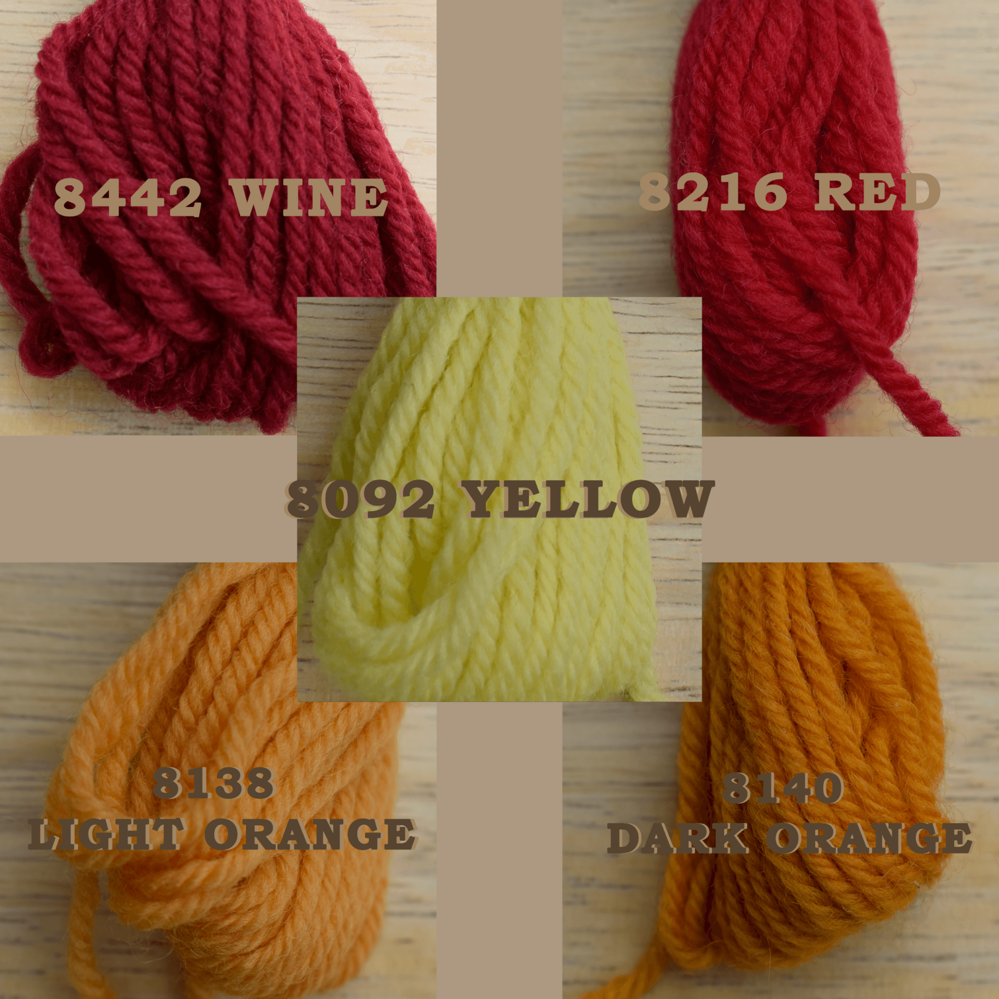 8092 Yellow, 8138 Orange Light, 8140 Orange Dark / Pumpkin, 8216 Red, 8412 Rose Mauve, 8442 Red Wine, 8452 Pink, 8490 Violet Eggplant, 8528 Purple, 8672 Blue, 8692 Royal Blue, 8808 Denim, 8936 Turquoise, 8938 Dark Turquoise, 8974 Green, 9022 Forest Green, 9112 Light Green (Celadon), 9194 Olive Green, 9362 Cream, 9450 Brown, 9532 Peach, 9800 Black