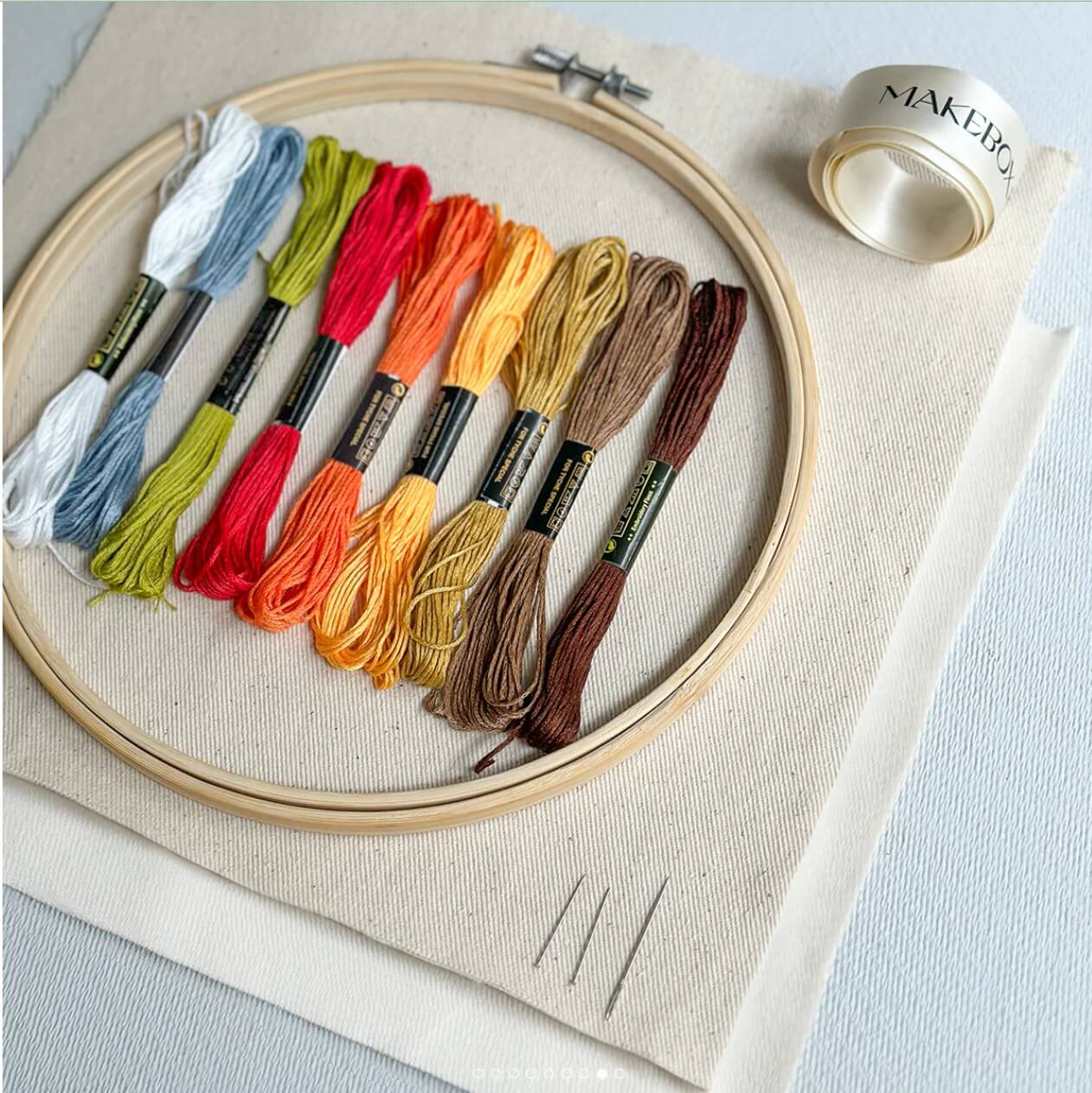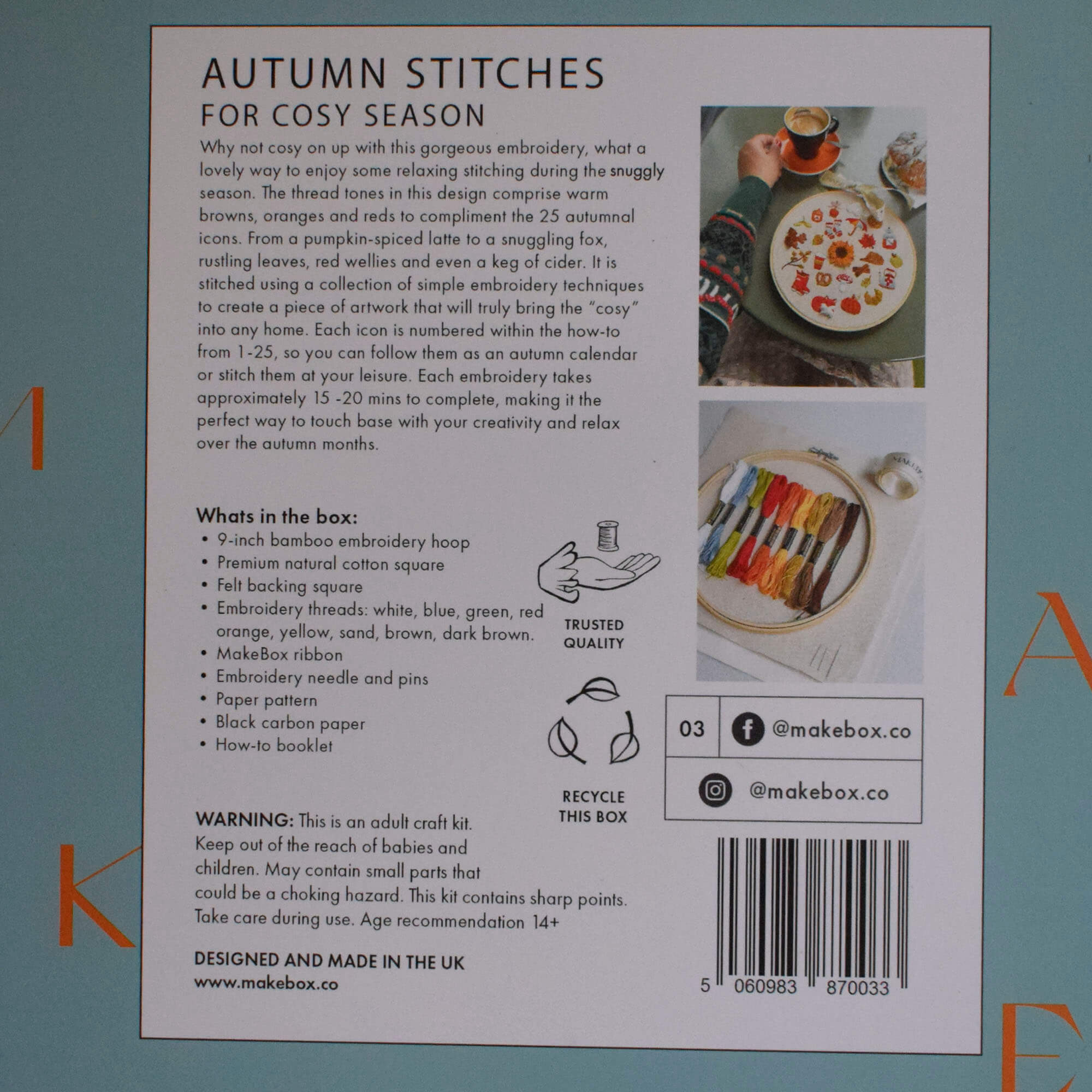 This kit includes a 9-inch hoop, raw denim fabric, a mix of rich autumn-themed threads, carbon paper, felt backing, needle, pins, Makebox ribbon and both pattern and instruction booklet. It is designed to be suitable for beginners while still enjoyable for more experienced stitchers.