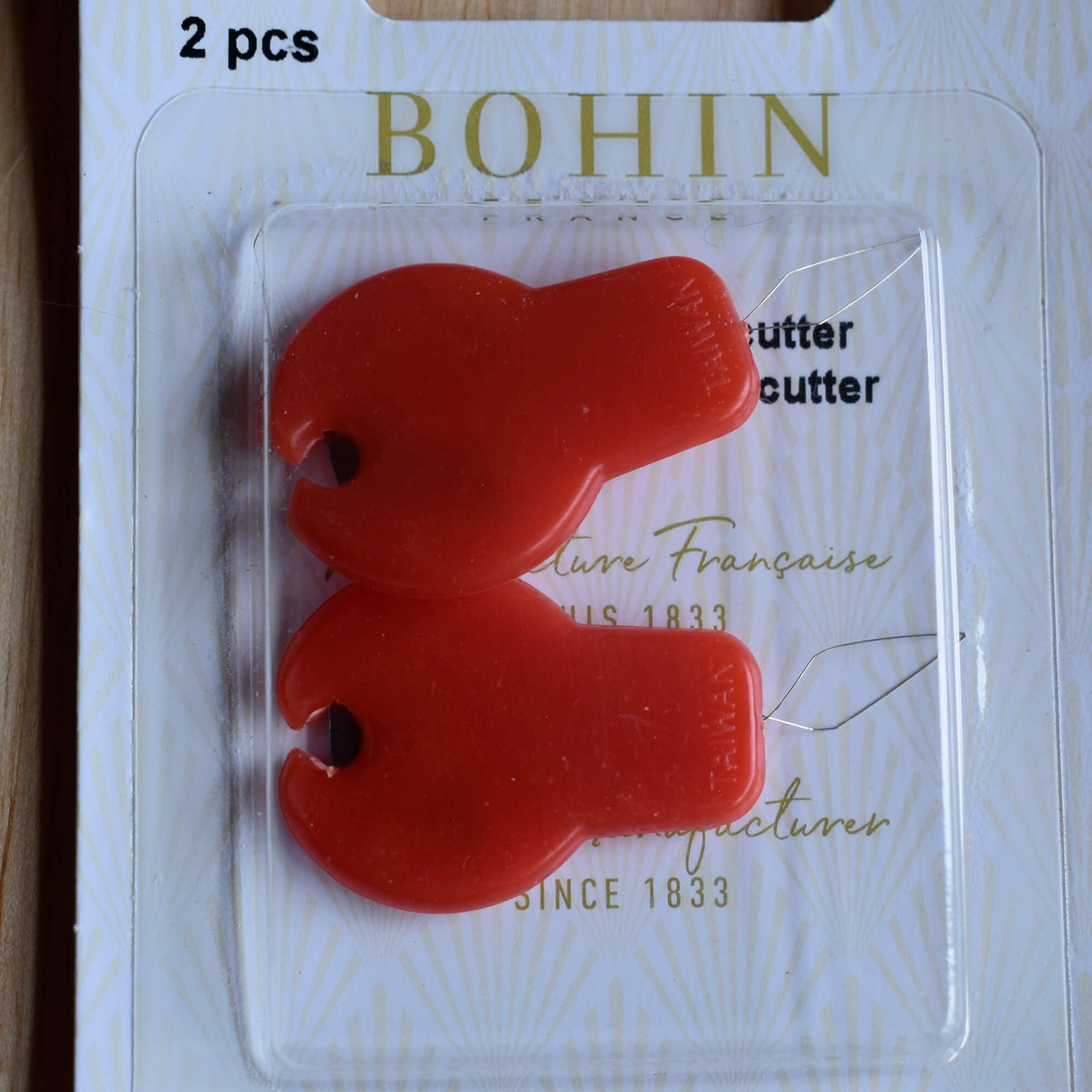 Each threader features a plastic body that encloses a strong metal wire loop, allowing thread to be guided smoothly through the eye of the needle. An integrated cutter is built into the body, making it easy to trim thread ends and remove excess thread without reaching for separate scissors.