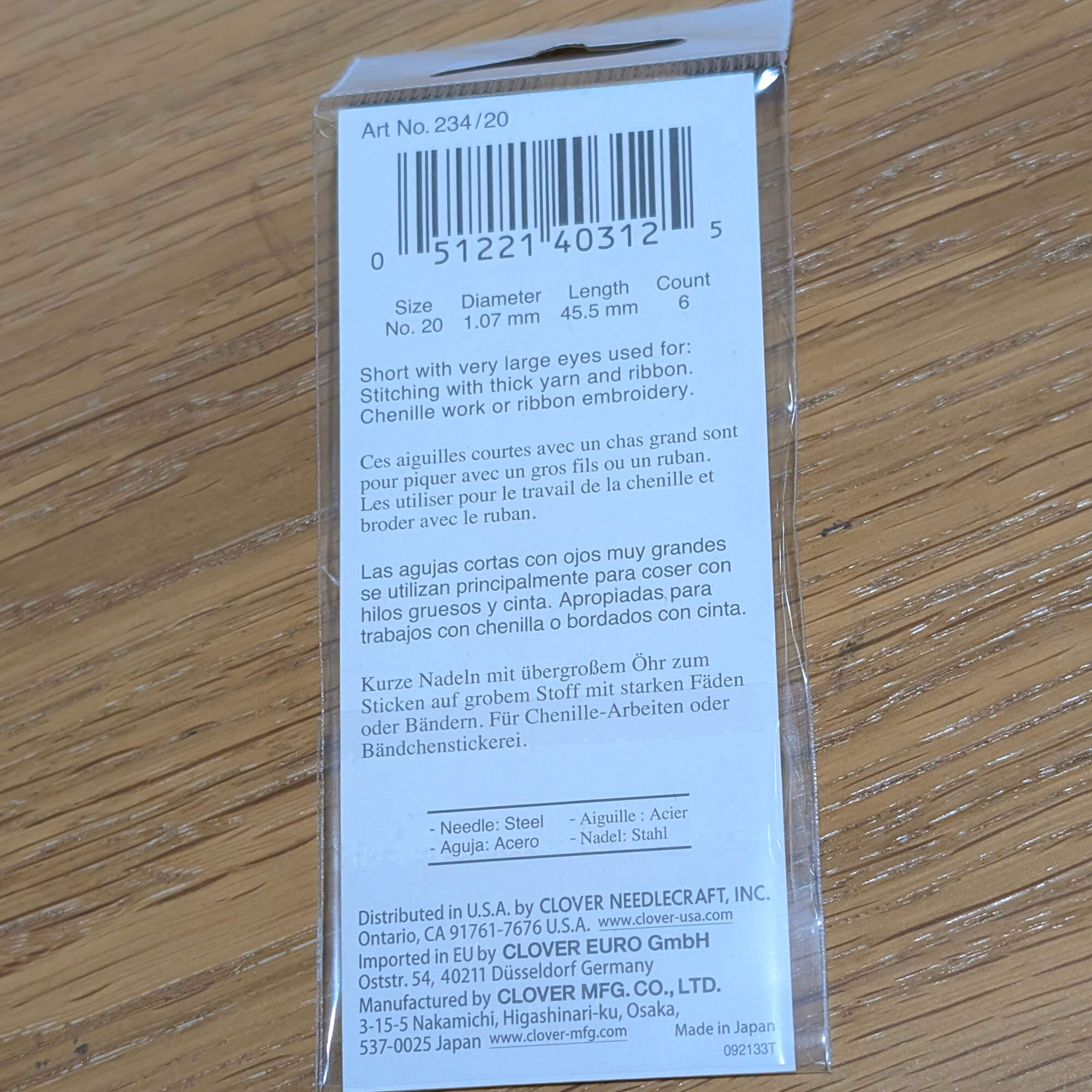 Each pack contains six needles and is compact enough to store easily in any sewing kit. Size No.20 is perfect when you need the strength of a chenille needle but with a slimmer profile.
