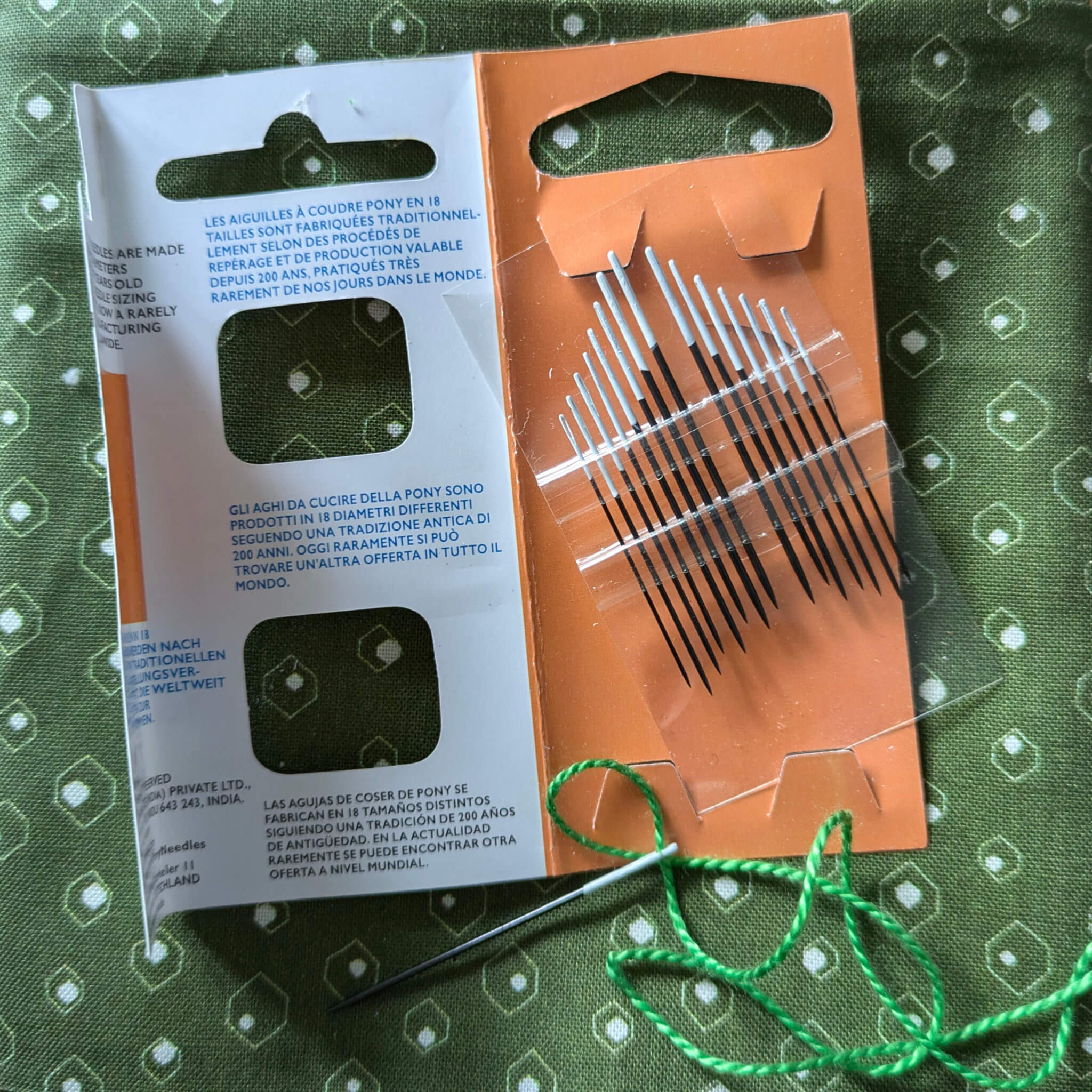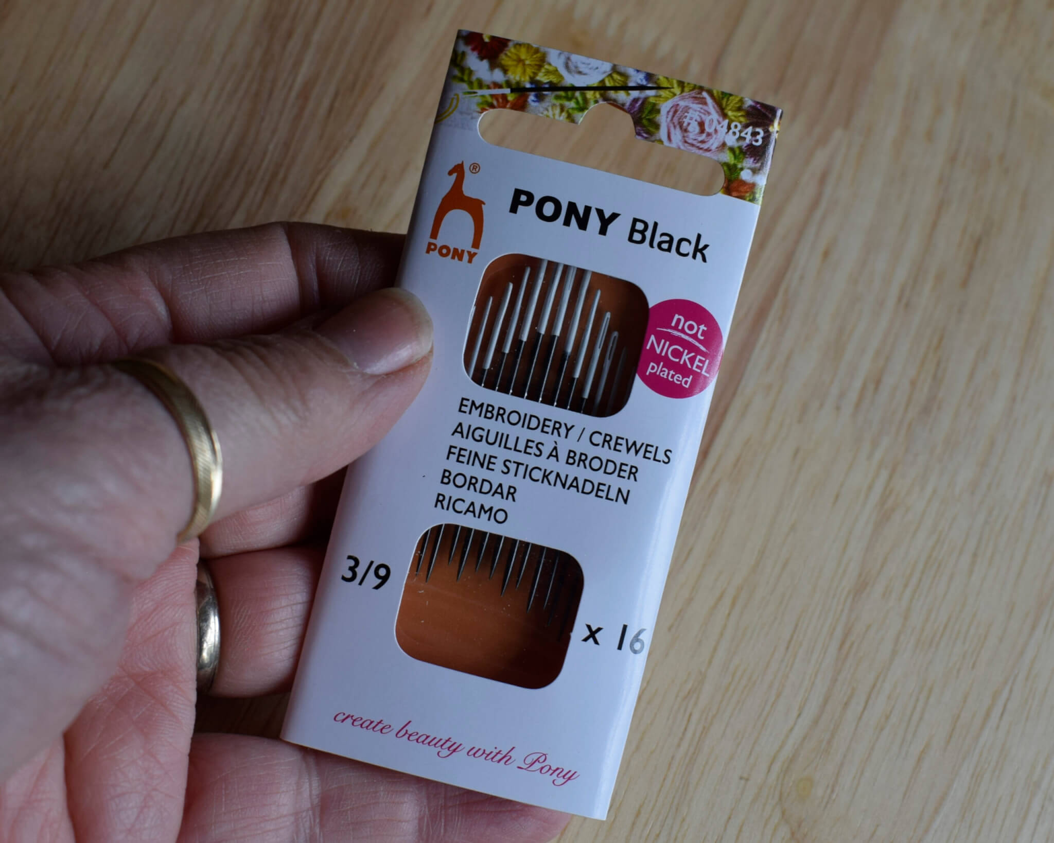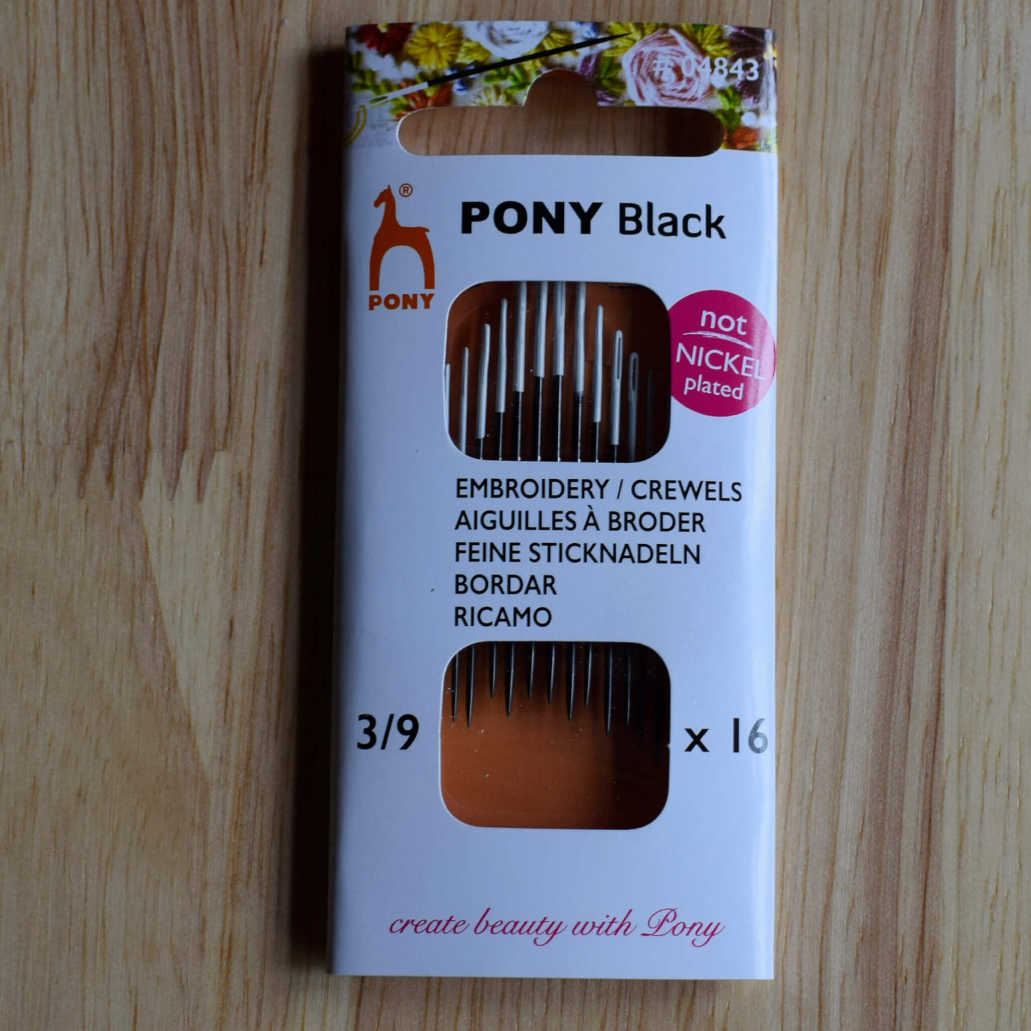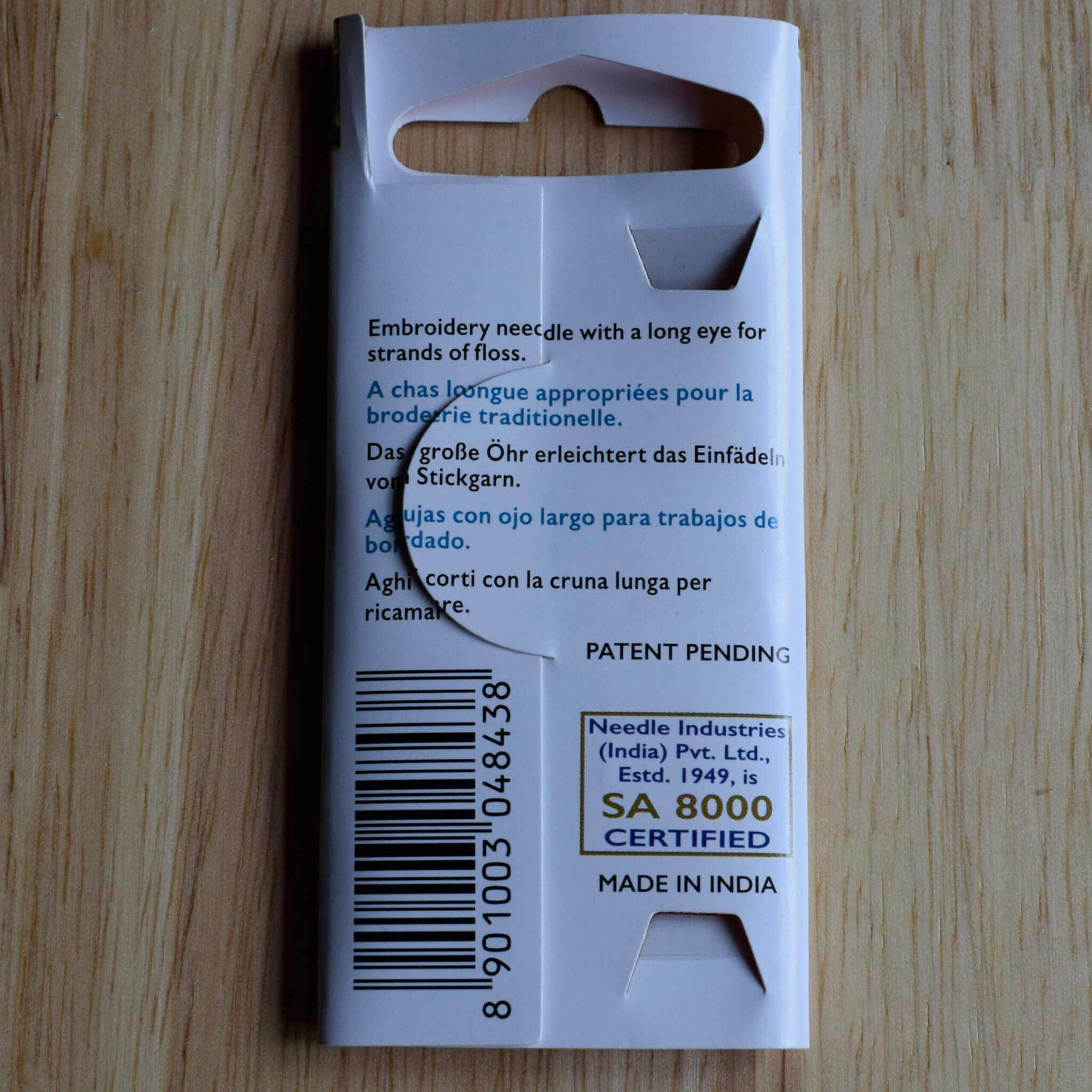 These fine embroidery needles are supplied in a paper folder, on a small plastic holder as a pack of 16 in assorted sizes 3/9.