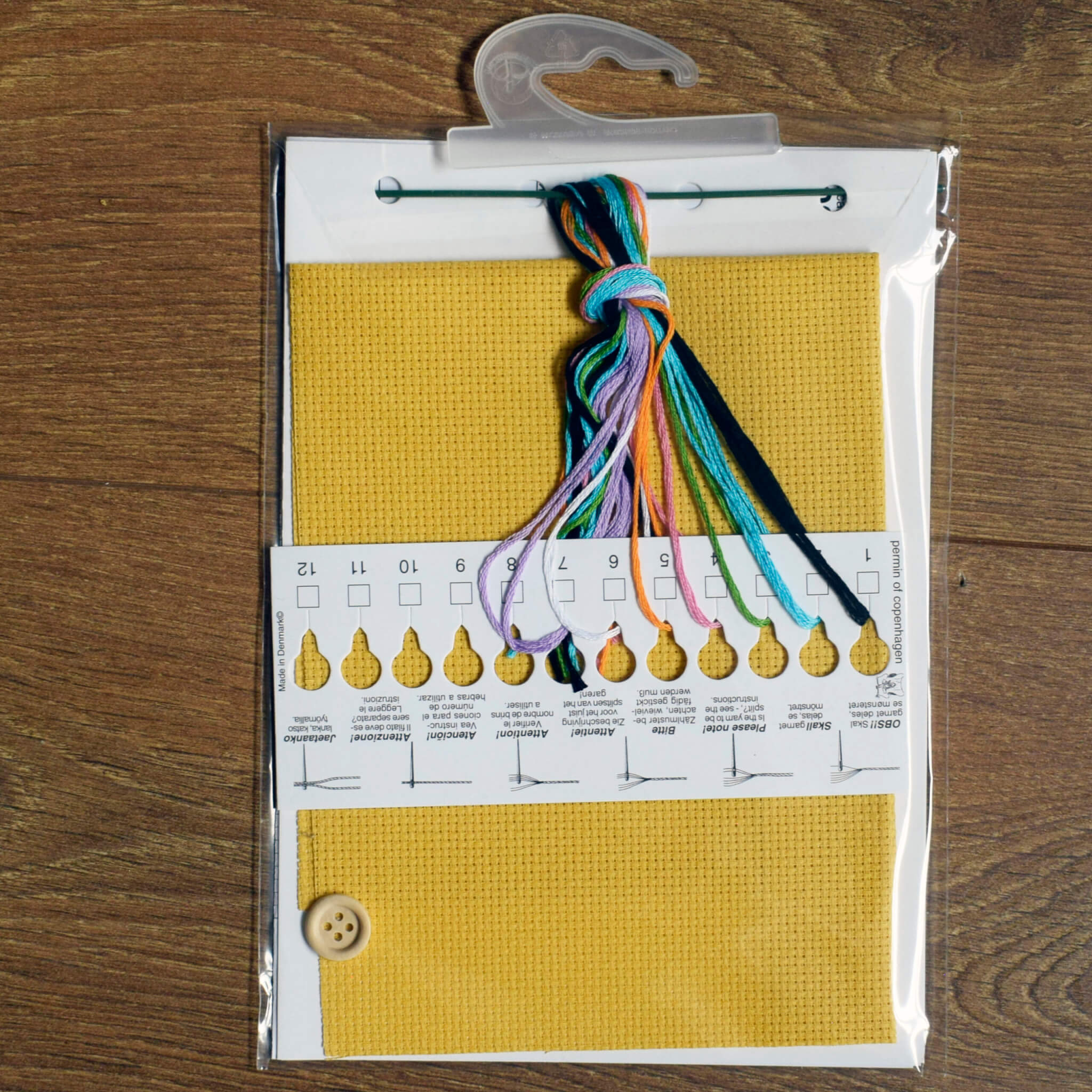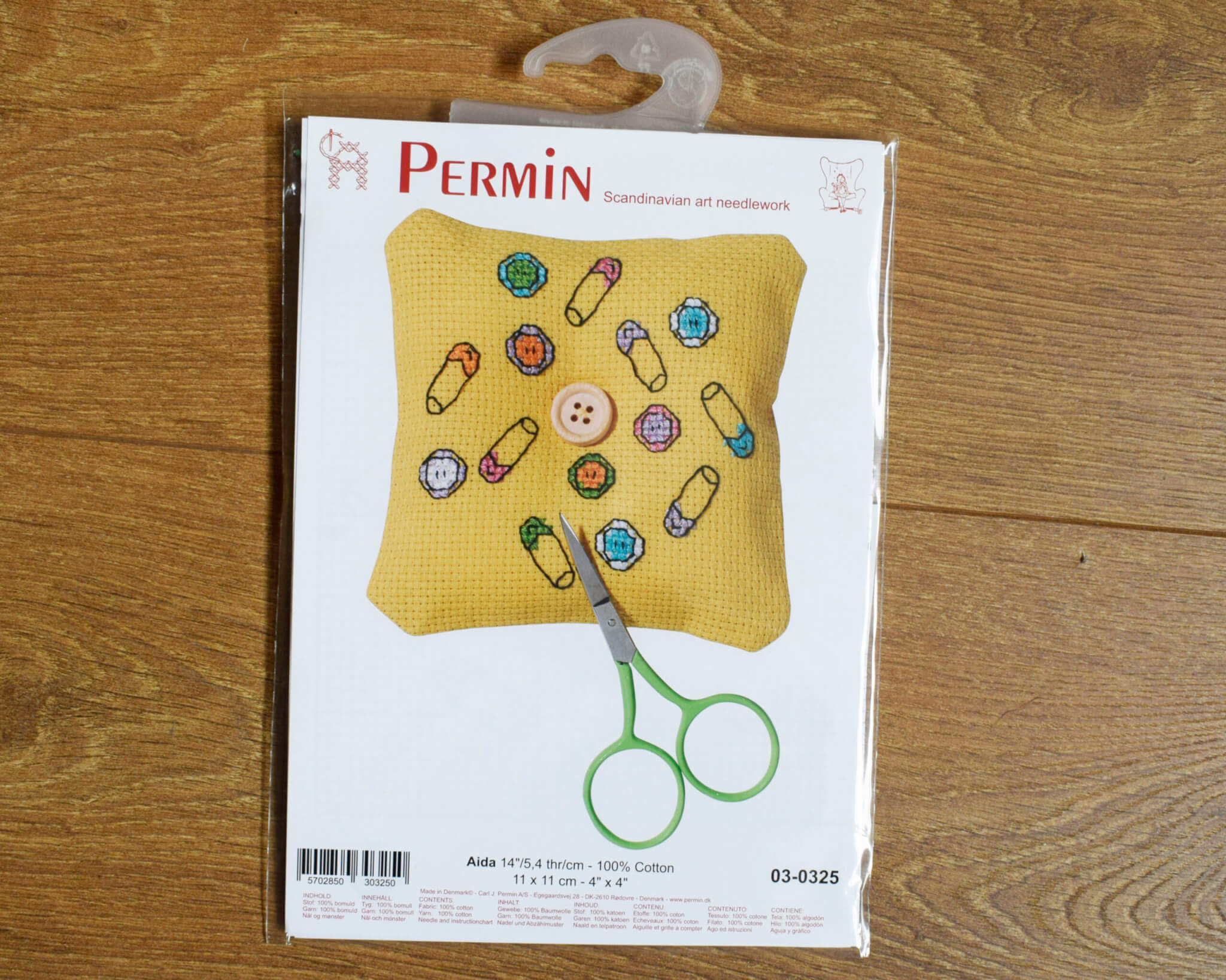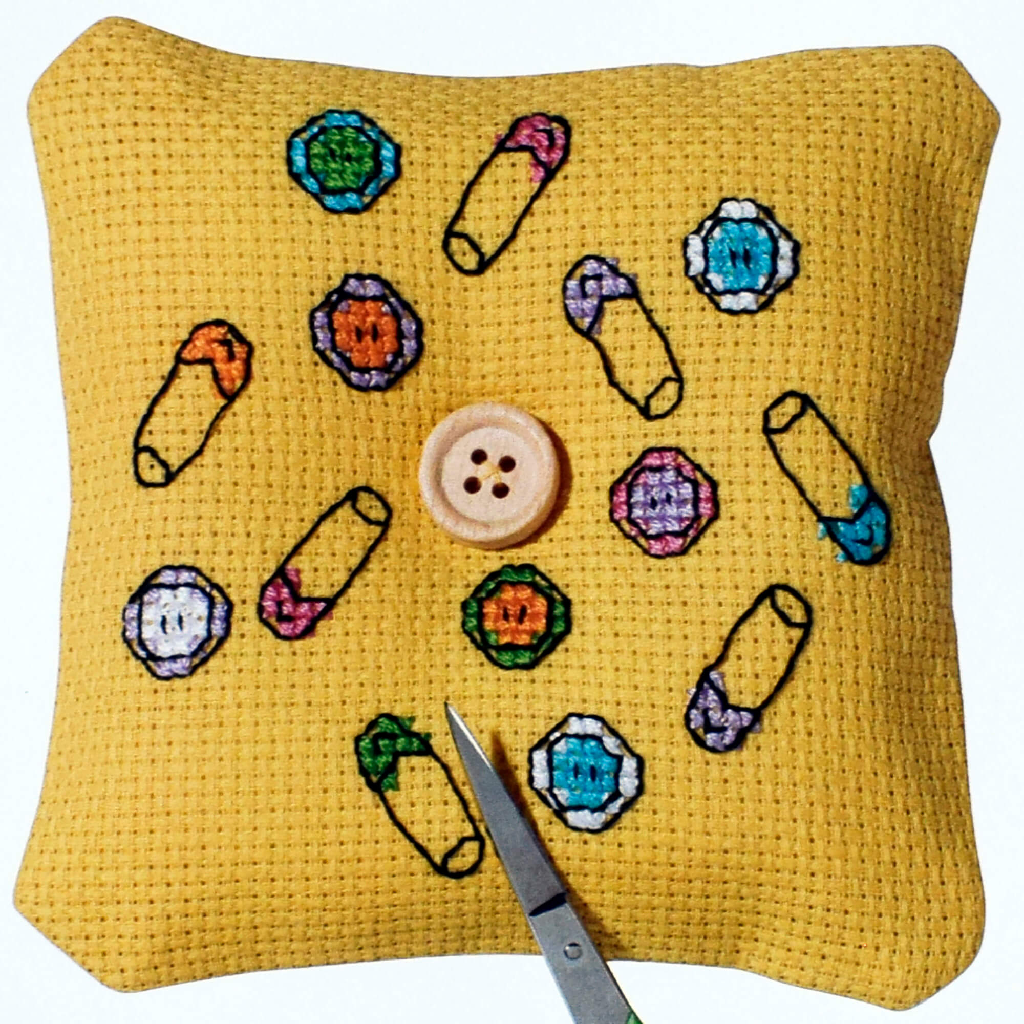 Create a delightful needle pillow or pincushion while indulging in a relaxing cross stitch project! This beginner-friendly kit features a charming button and safety pins design stitched on a warm mustard yellow Aida fabric.