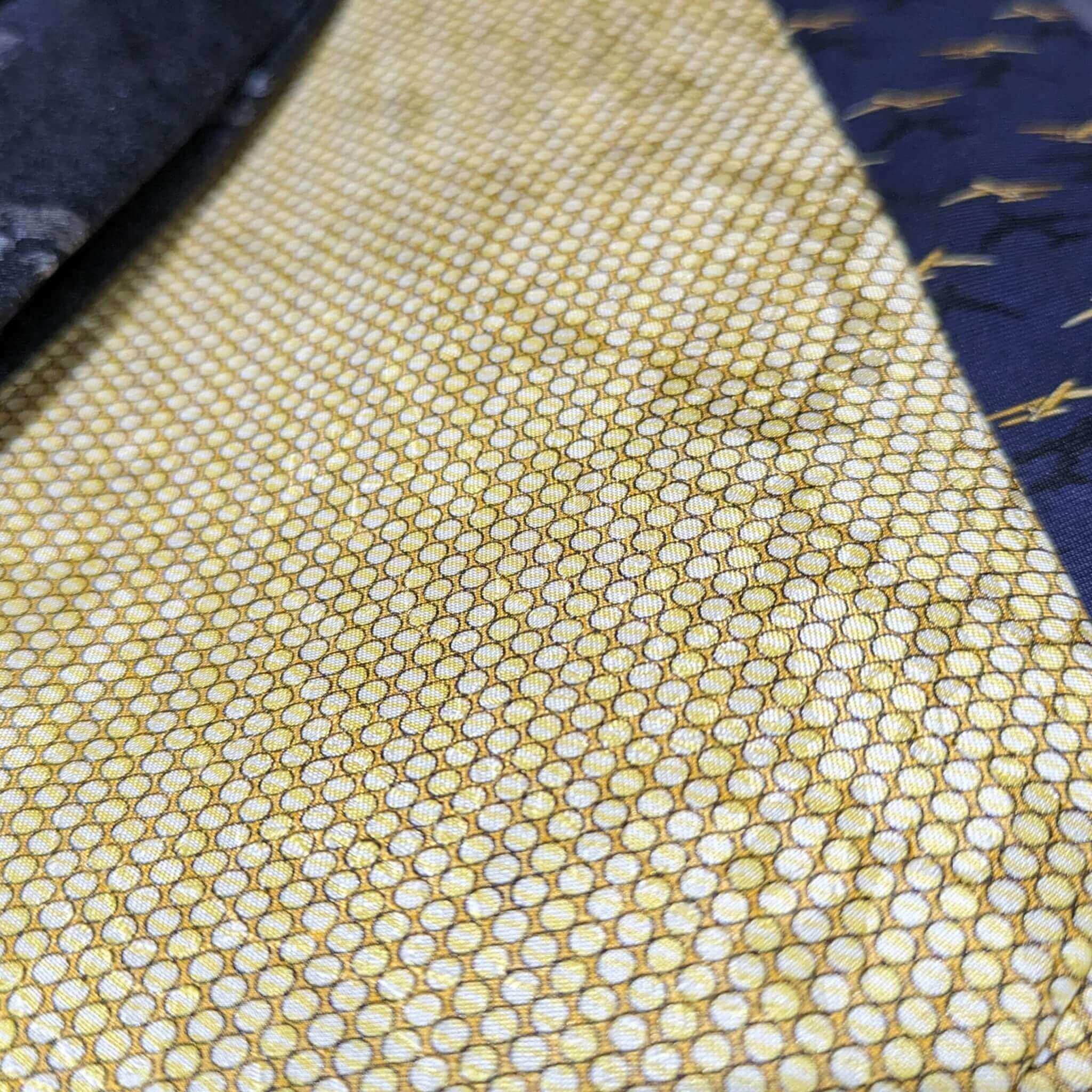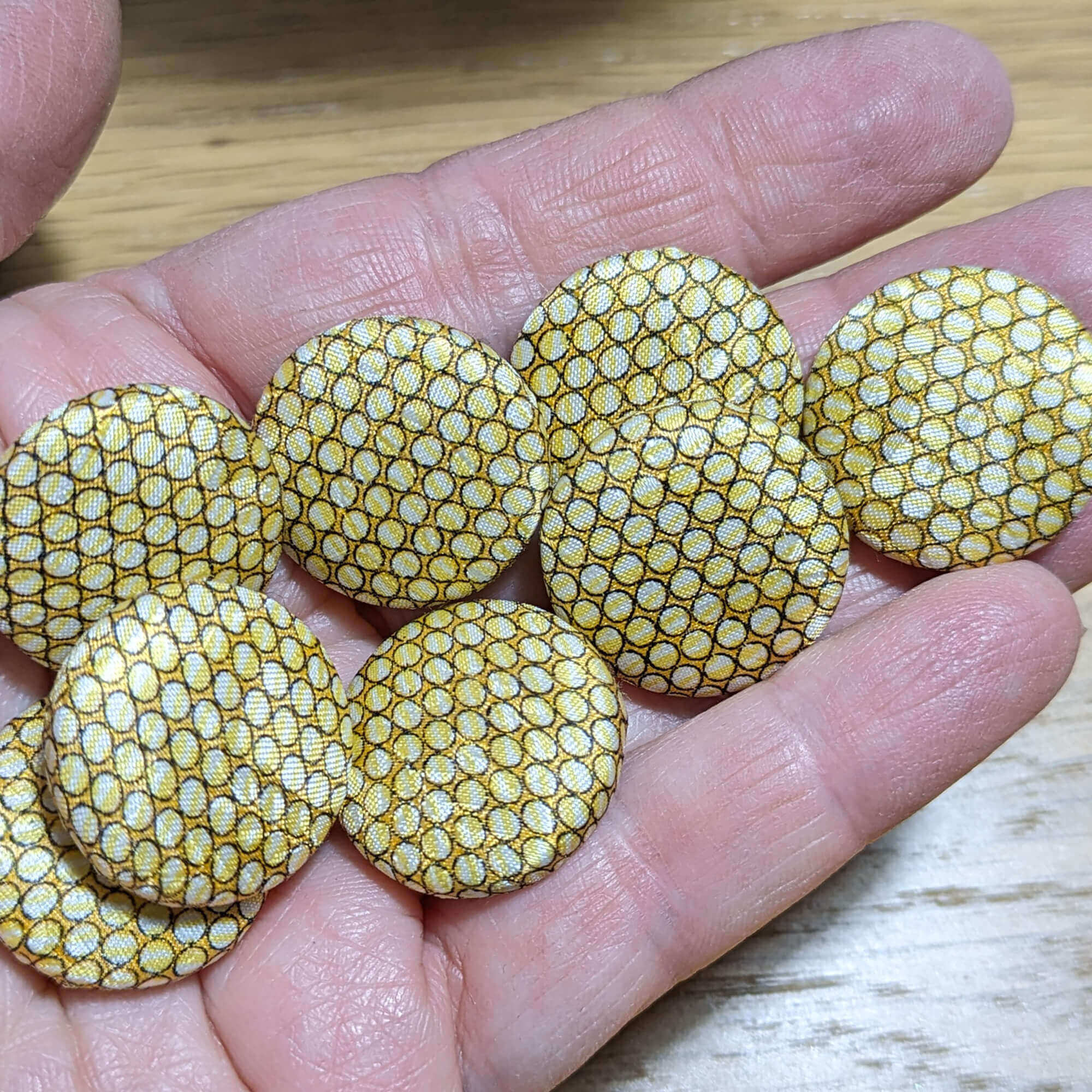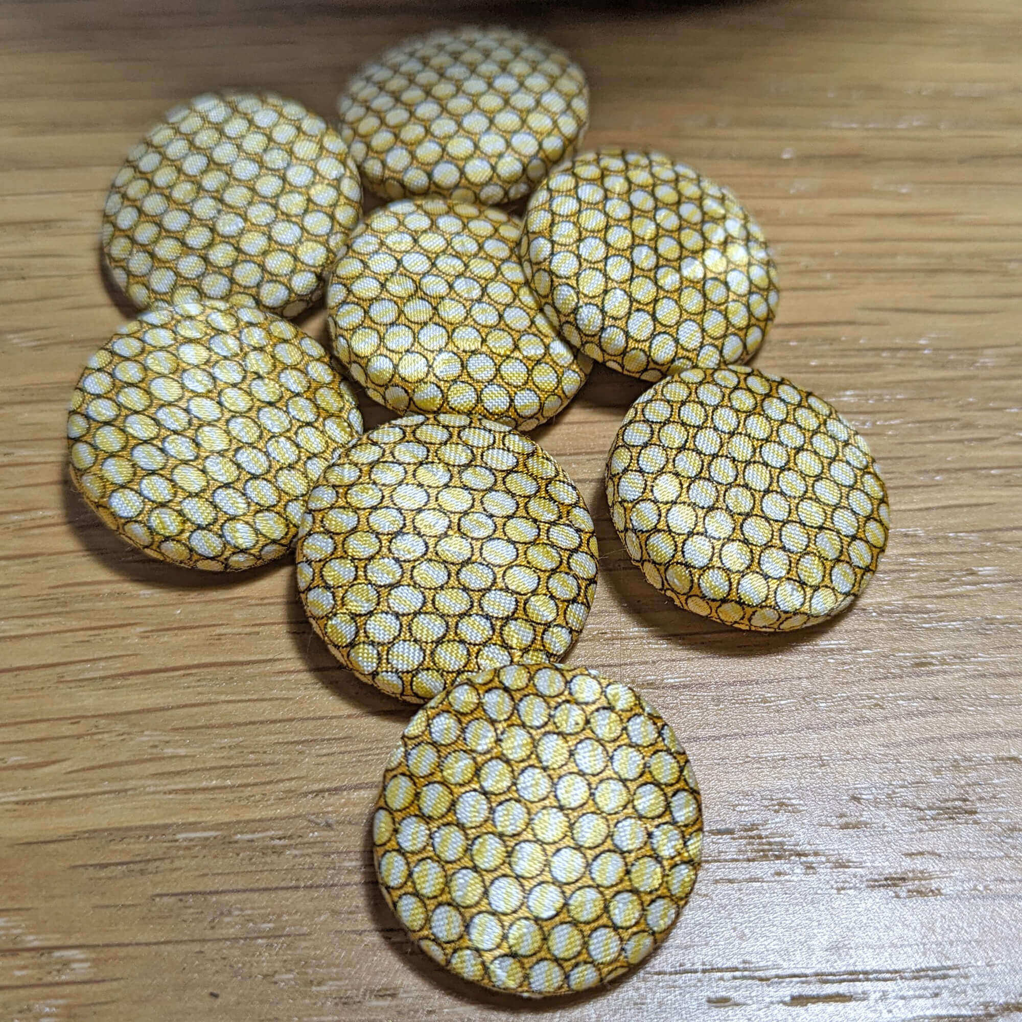 Sustainable fashion accessories, these buttons are hand covered with a 100% silk fabric which comes from a high quality vintage tie ensuring a unique and eco-conscious touch. It features a striking design of gold shapes reminiscing of honeycomb.