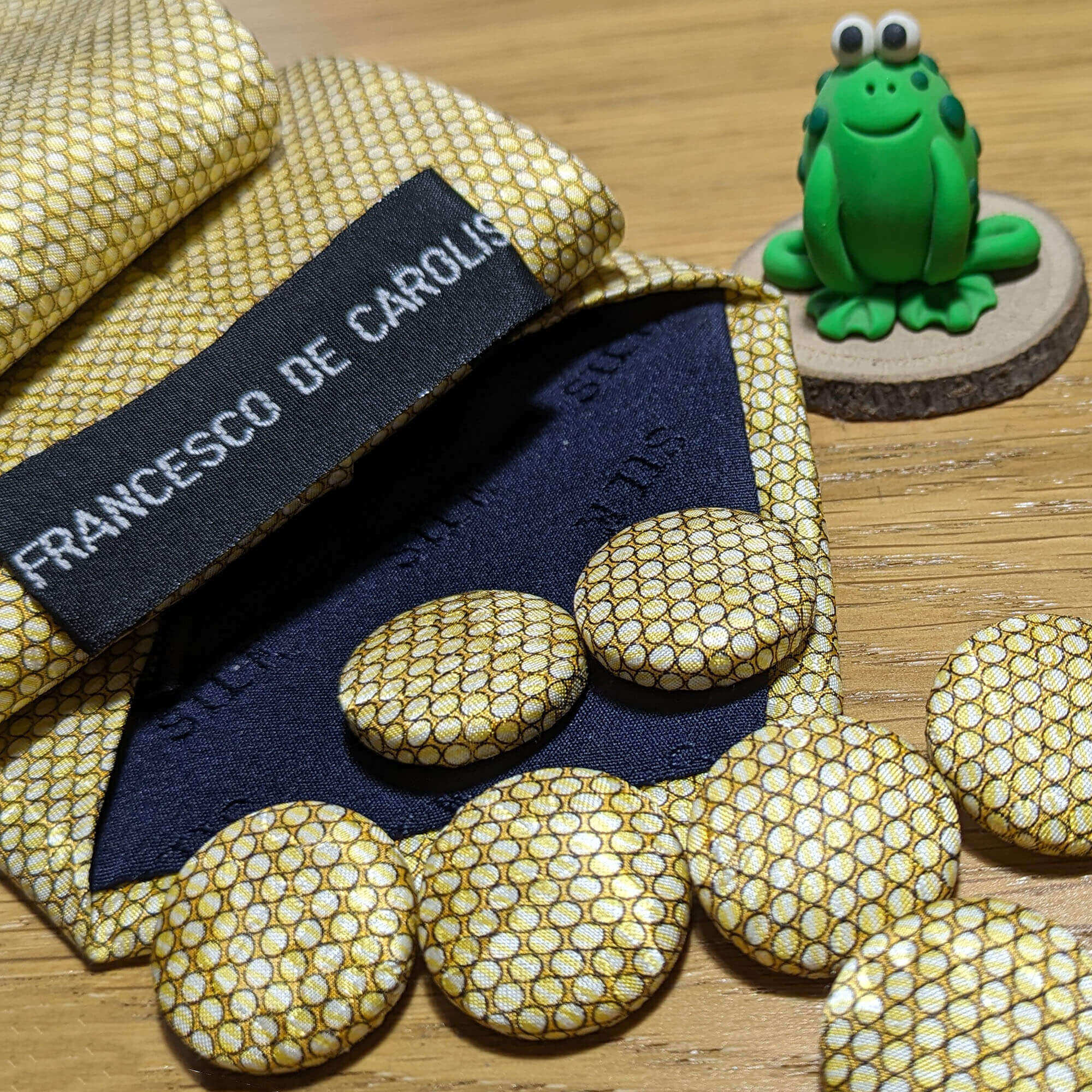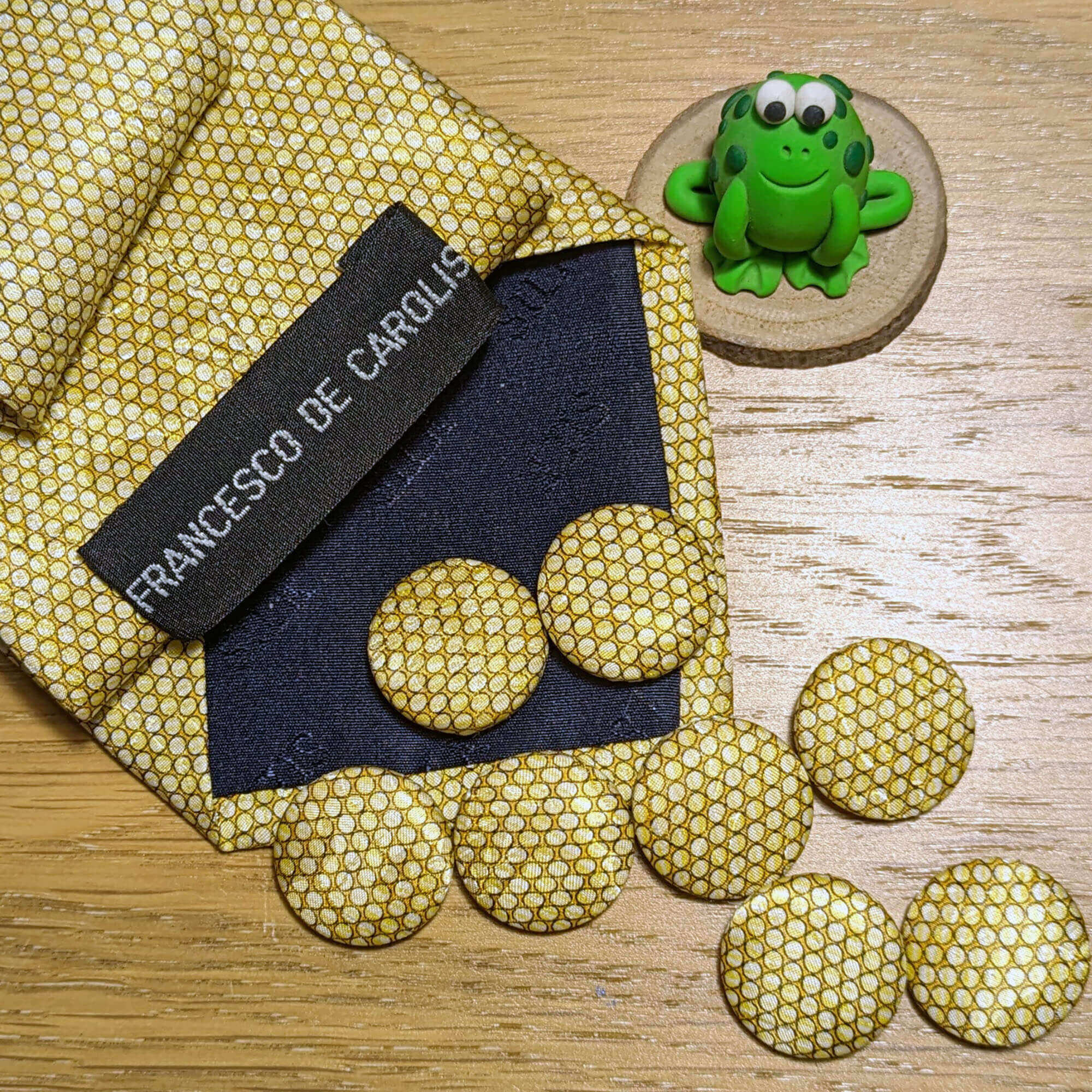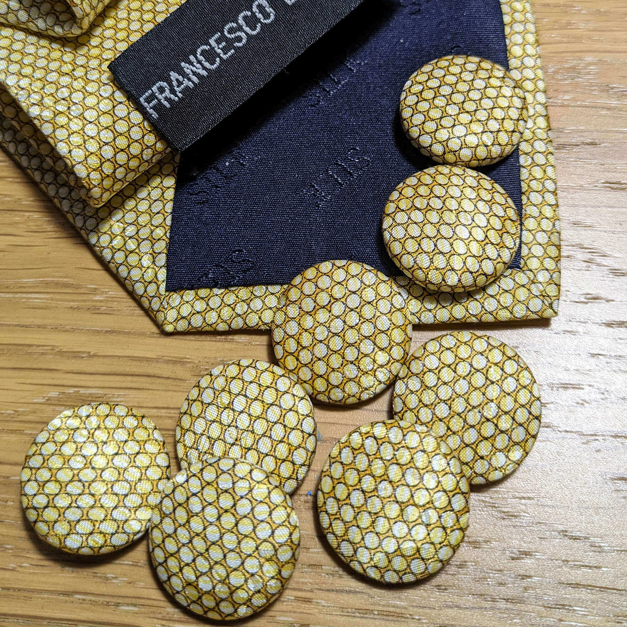 Each button is crafted from 100% recycled silk tie, ensuring both a unique and eco-conscious touch. These are made in limited numbers because I only have the one necktie. So once it has been fully used, I will not make anymore in this design.