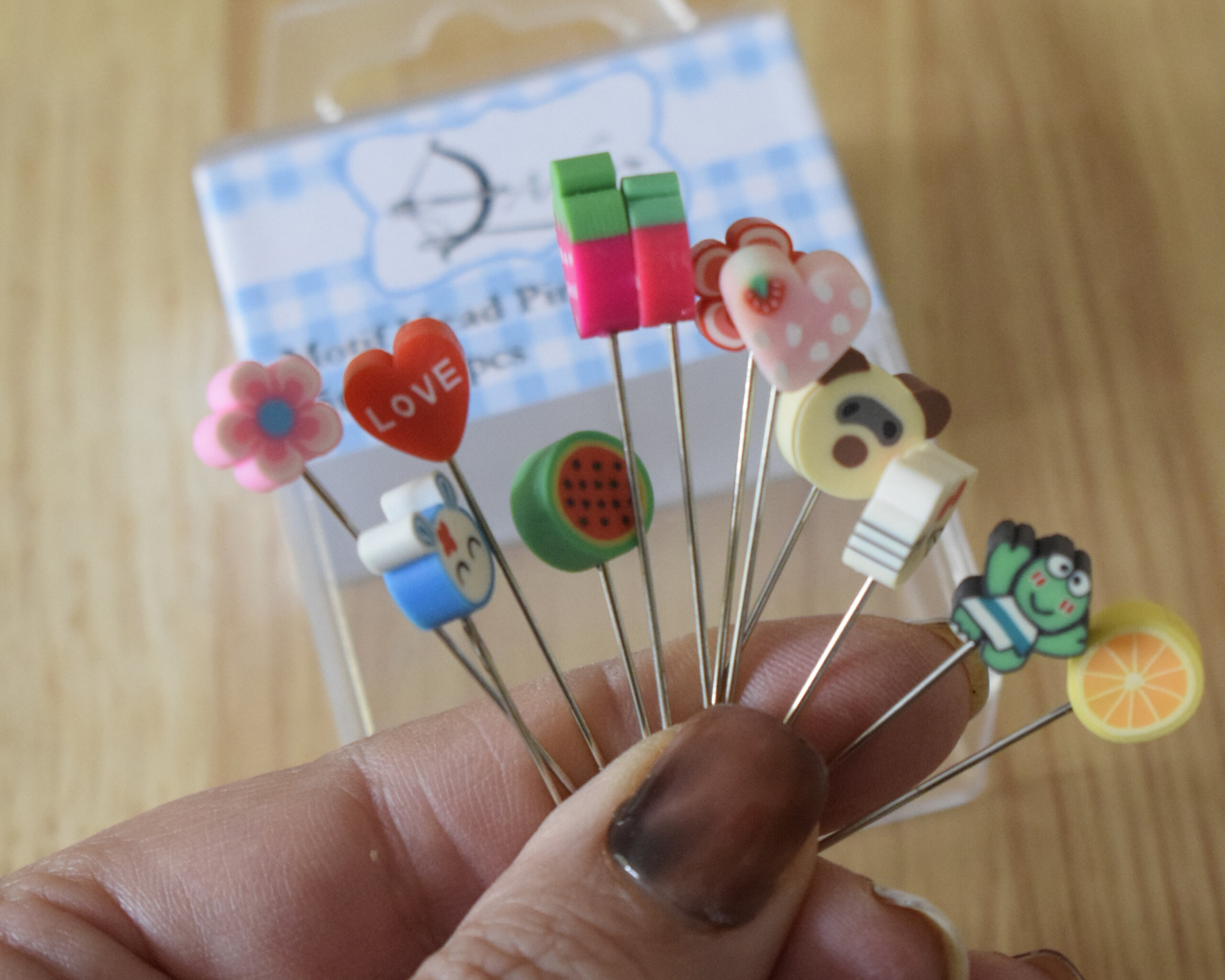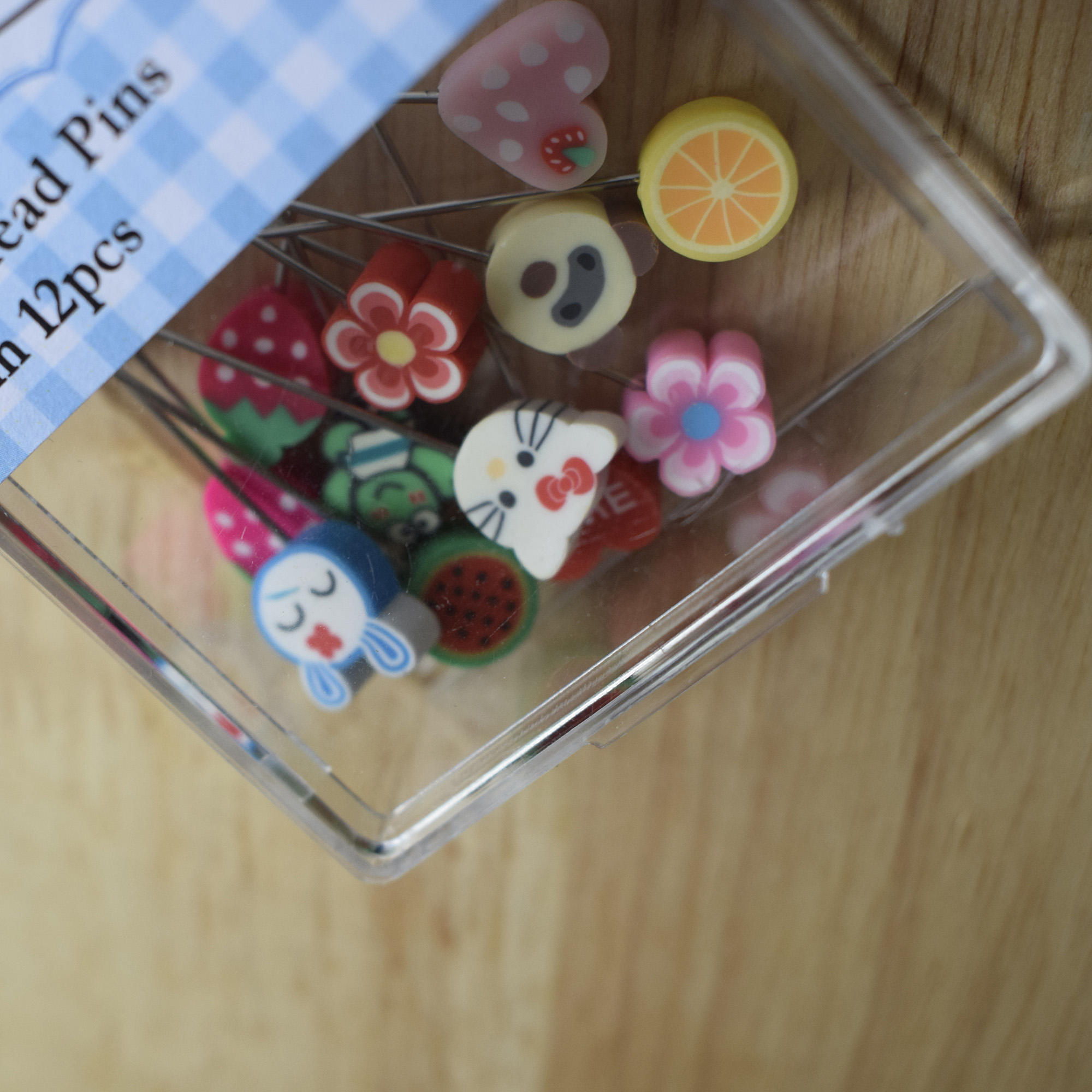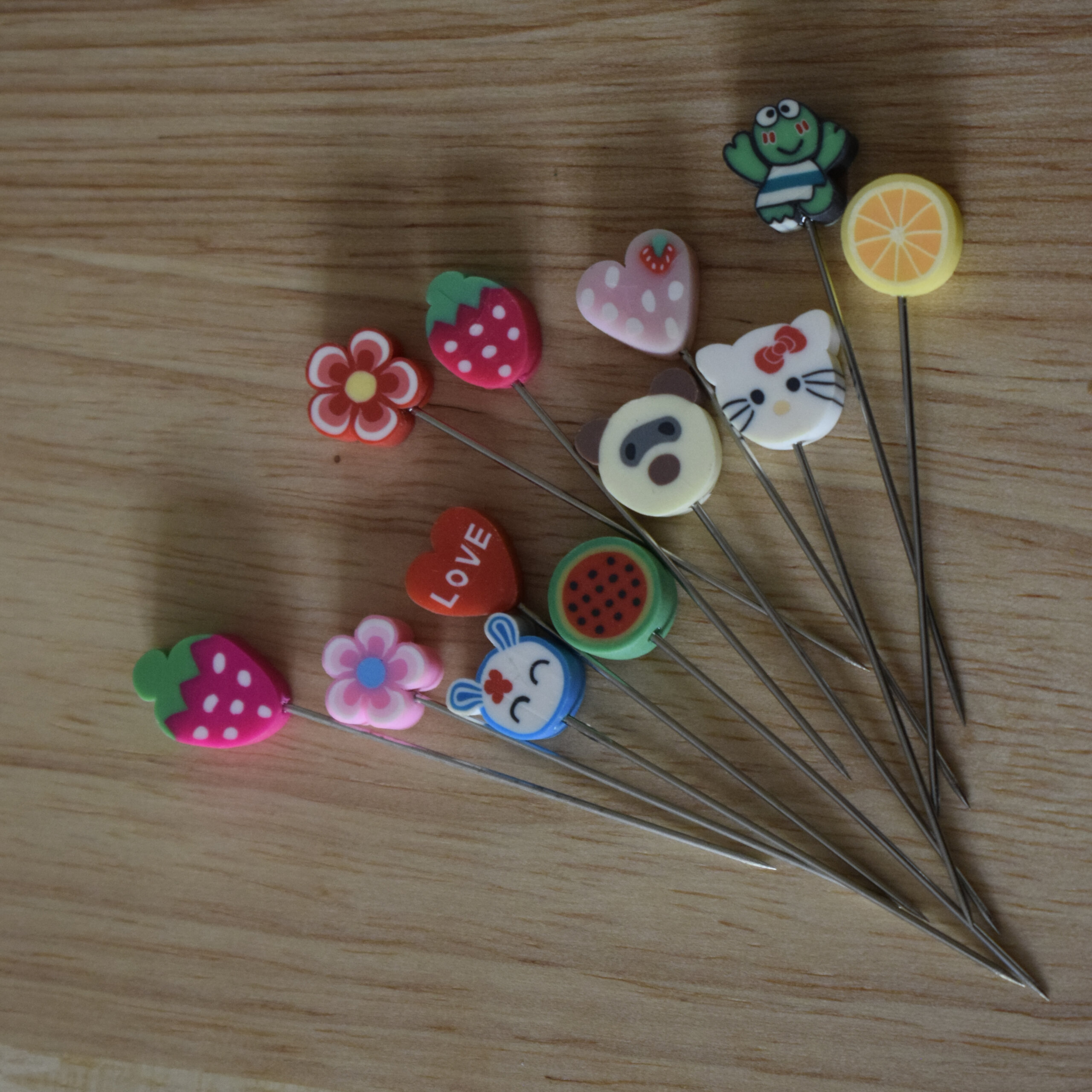The assorted designs include cats, rabbits, frogs, bears, flowers, hearts, strawberries, oranges, and watermelons — a cheerful mix that brings a little personality to your pin cushion.