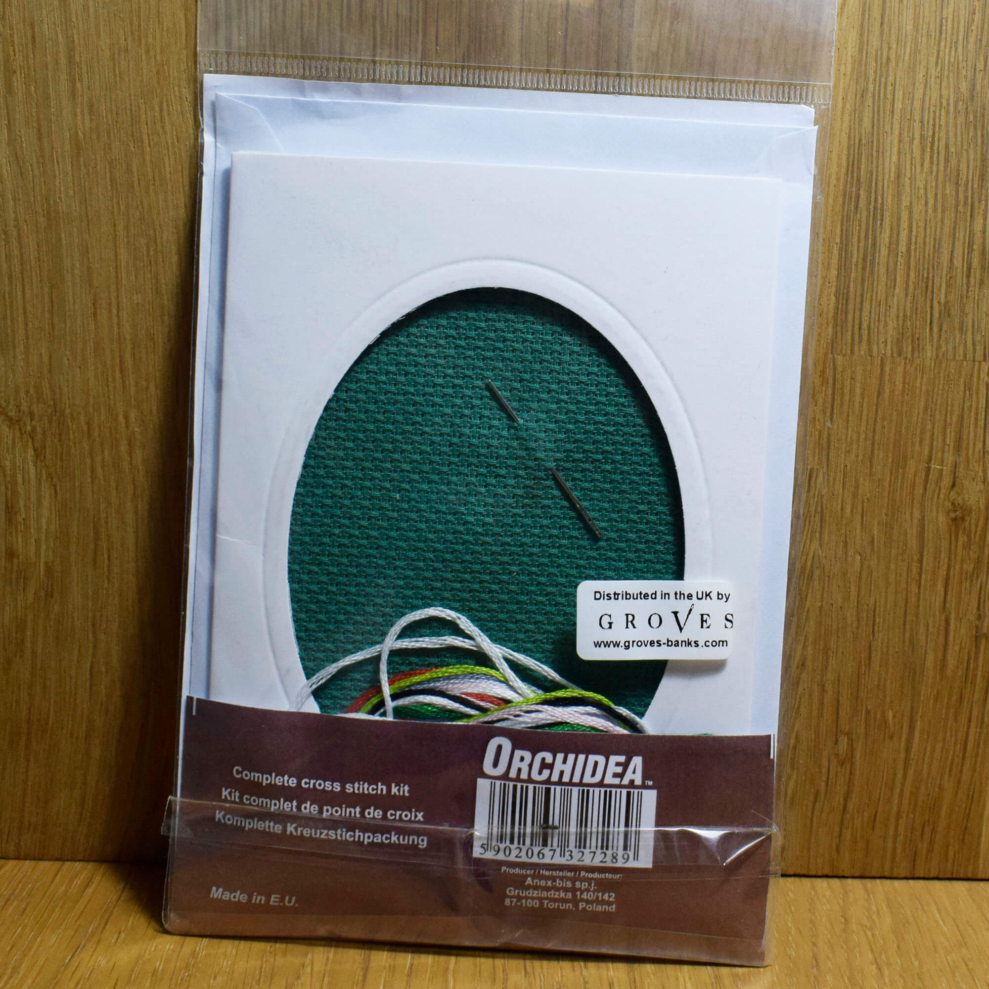 Counted cross stitch greeting card kit. Kit includes: green, 14 count, cotton, aida fabric; pre-sorted, 6-ply, mouliné, stranded cotton; blank card; envelope; needle; chart and instructions in multiple languages (GB, NL, PL, S, F, RUS, N, FIN, DK, H, D, CZ, I). Approximate finished size: (w/h) 10.5 x 15cm or 4 x 6in. Difficulty level: medium. Handwash only.