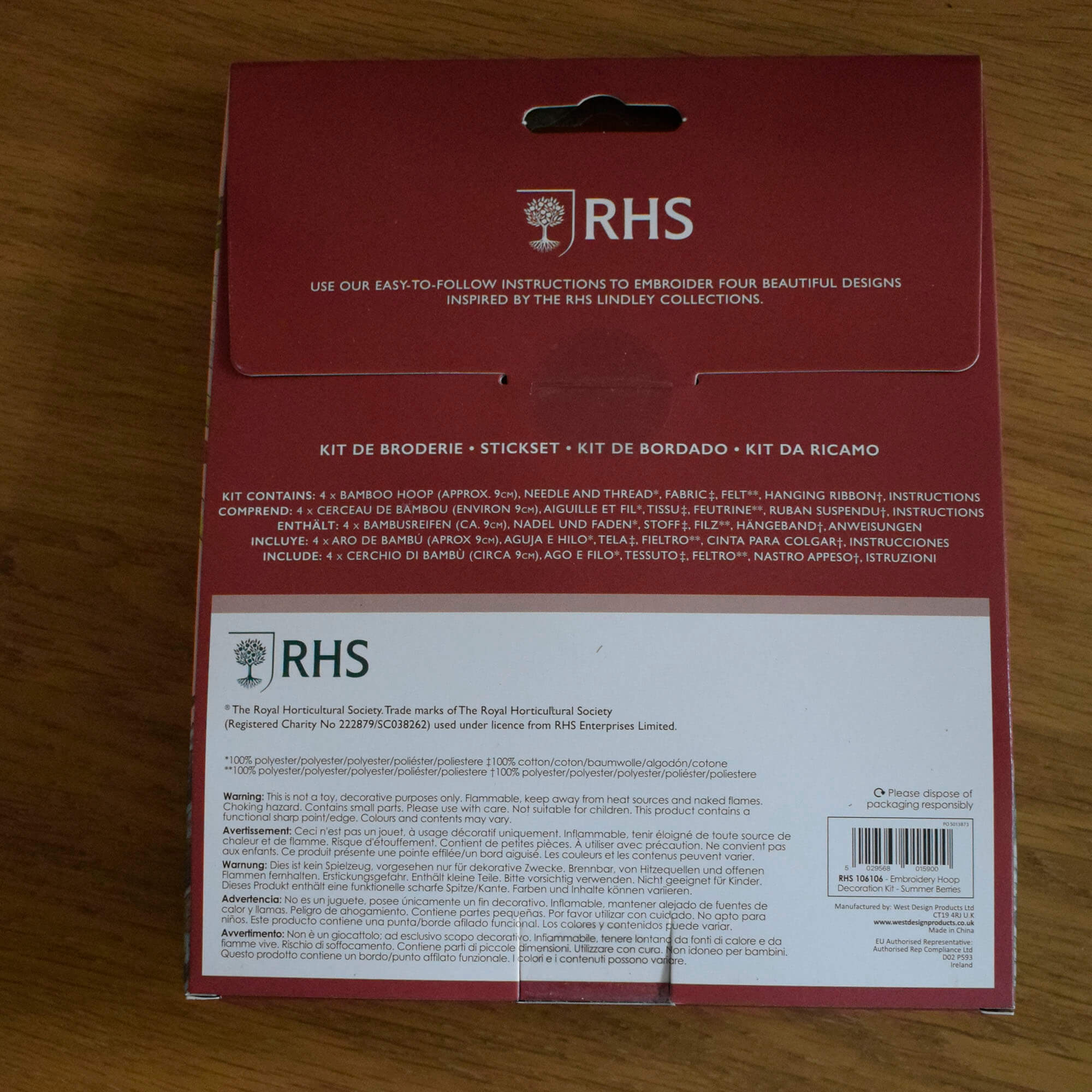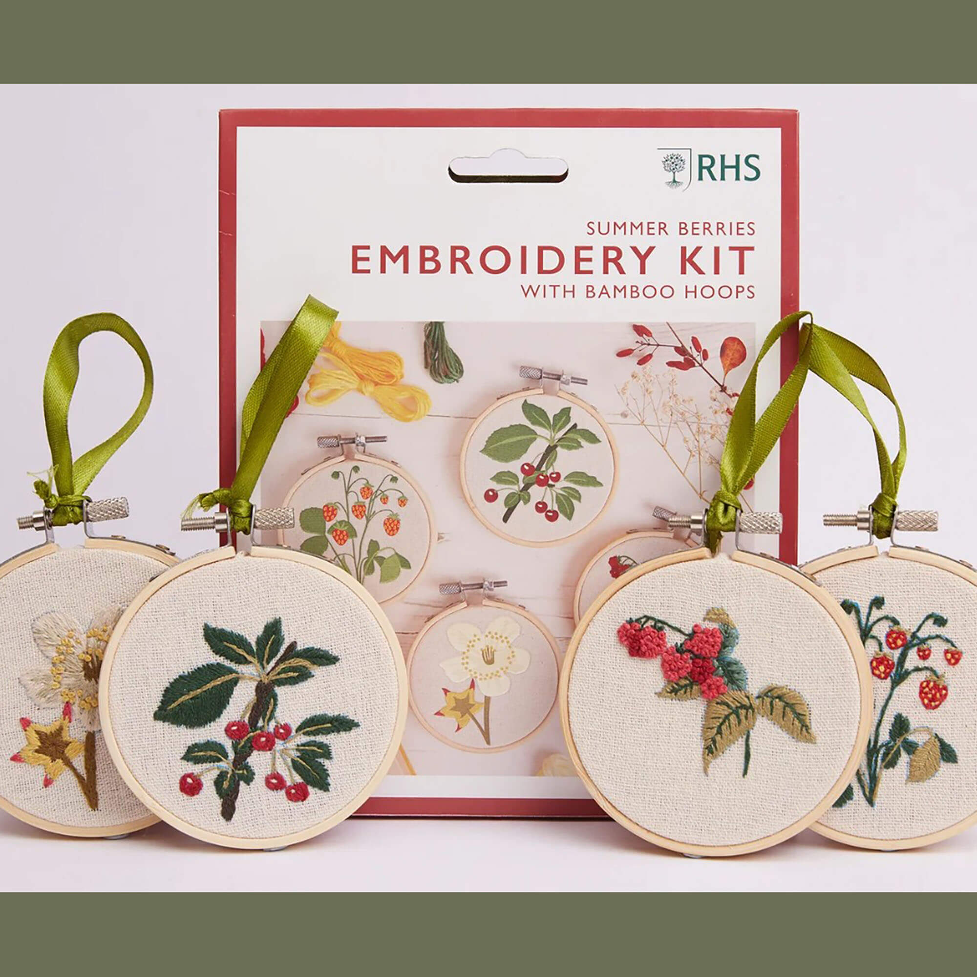 The RHS Summer Berries Embroidery Kit invites you to stitch four delightful mini hoop designs, each inspired by summer berries and based on RHS botanical artwork.