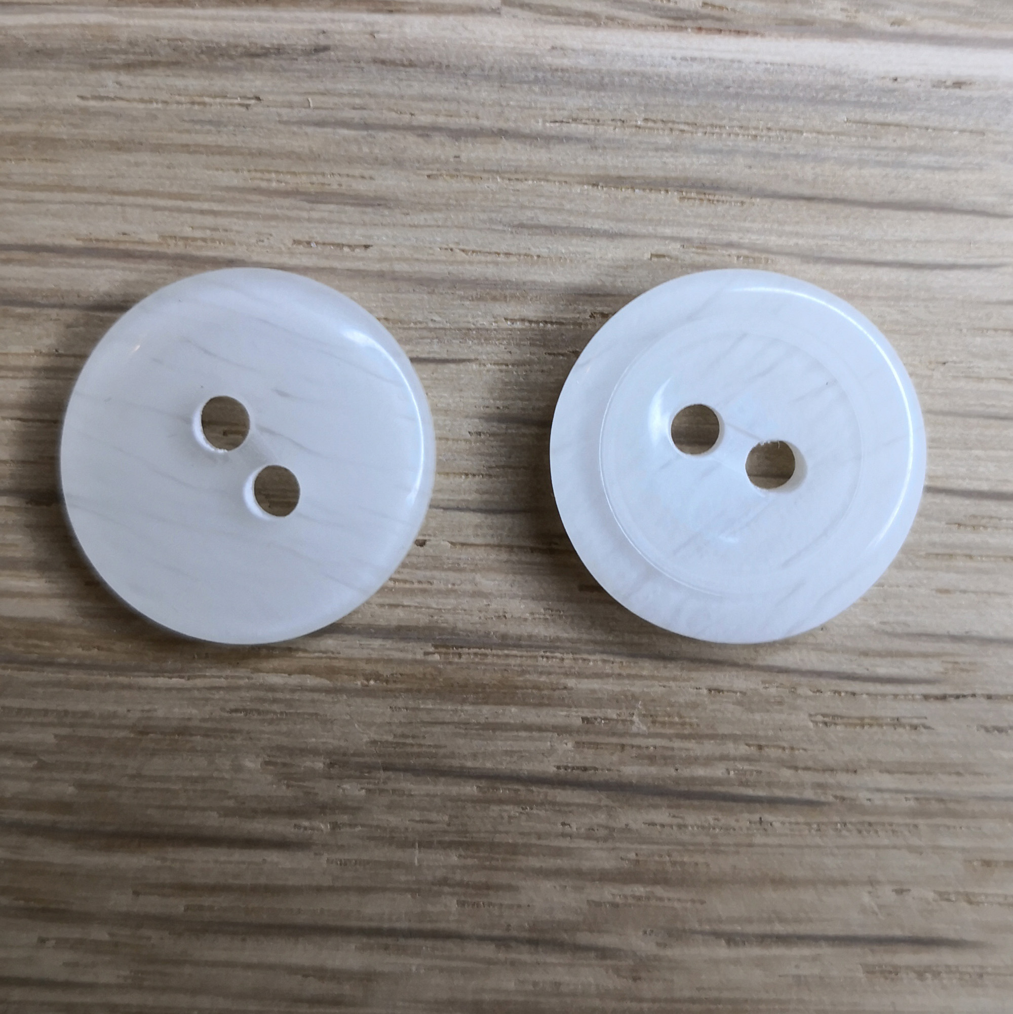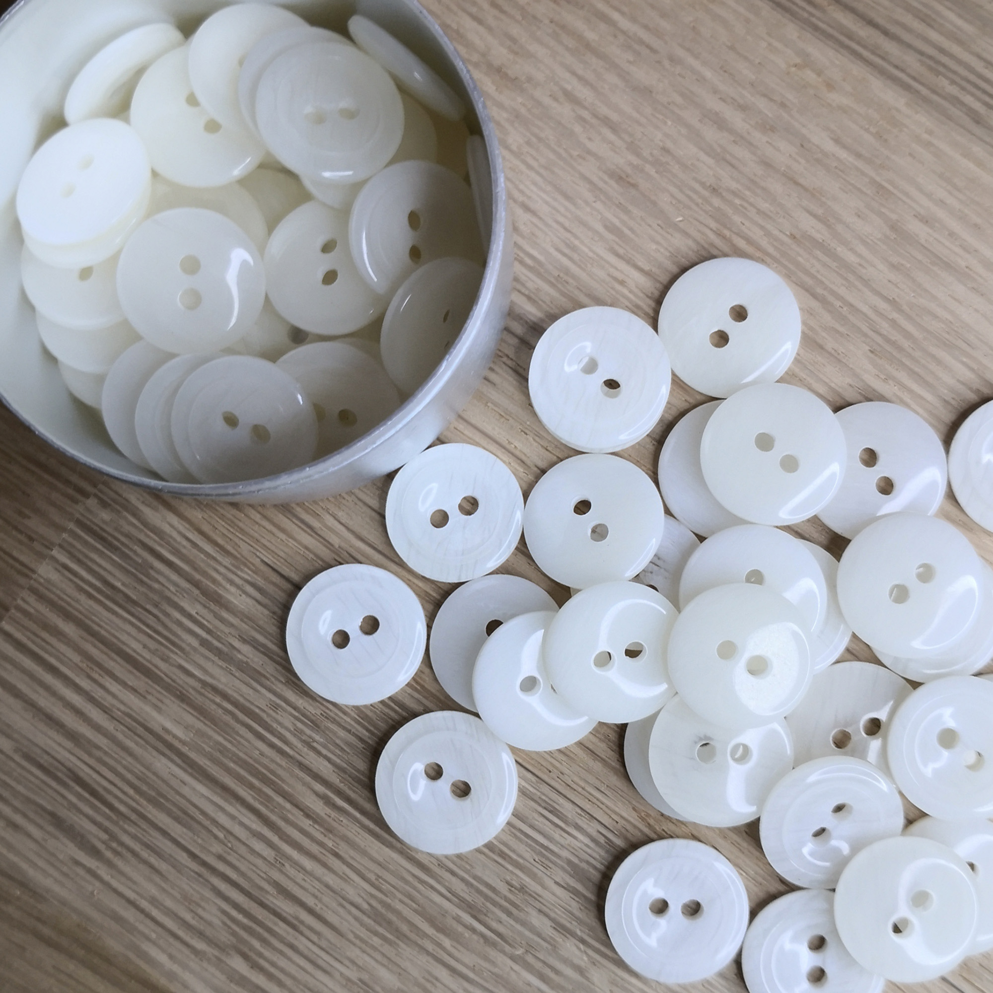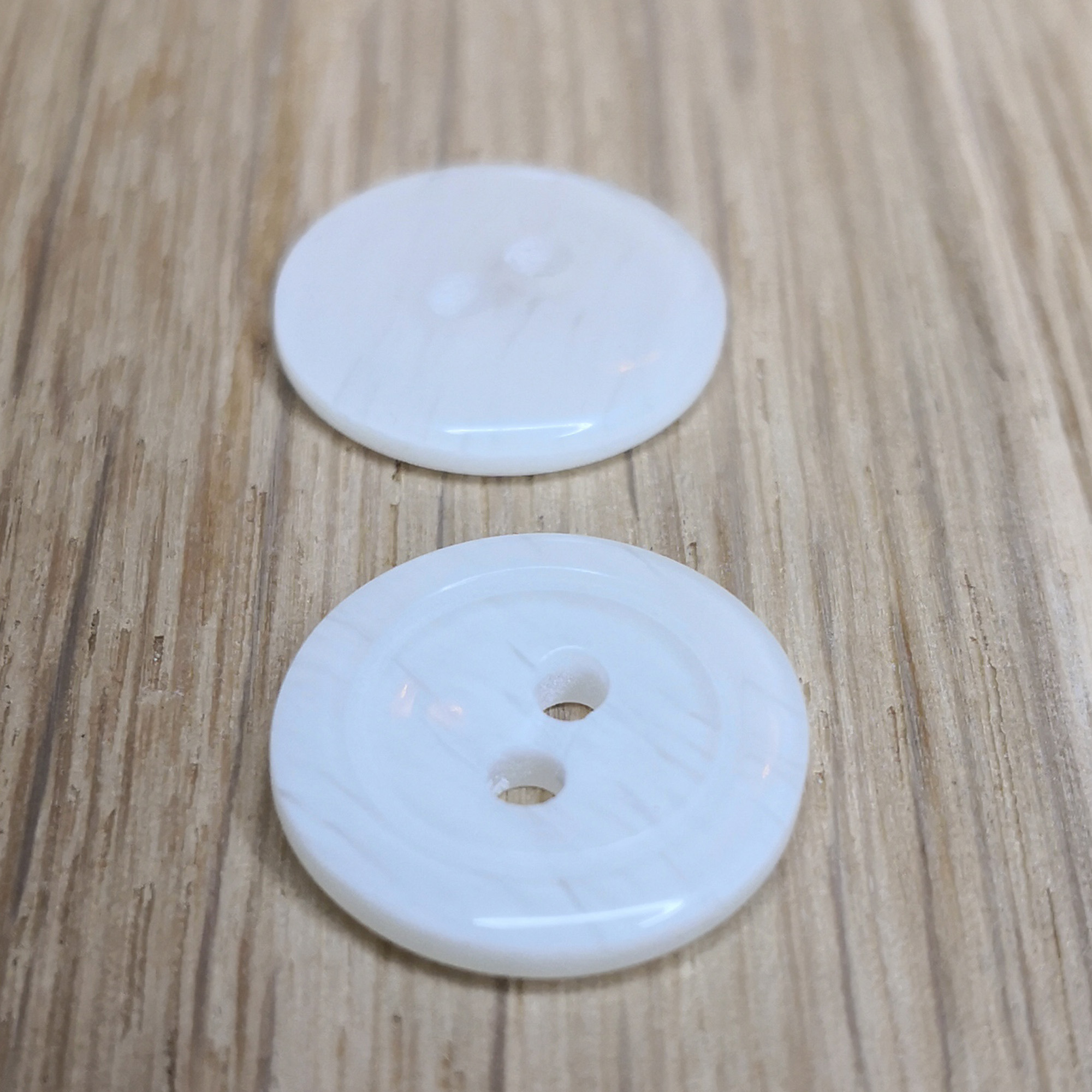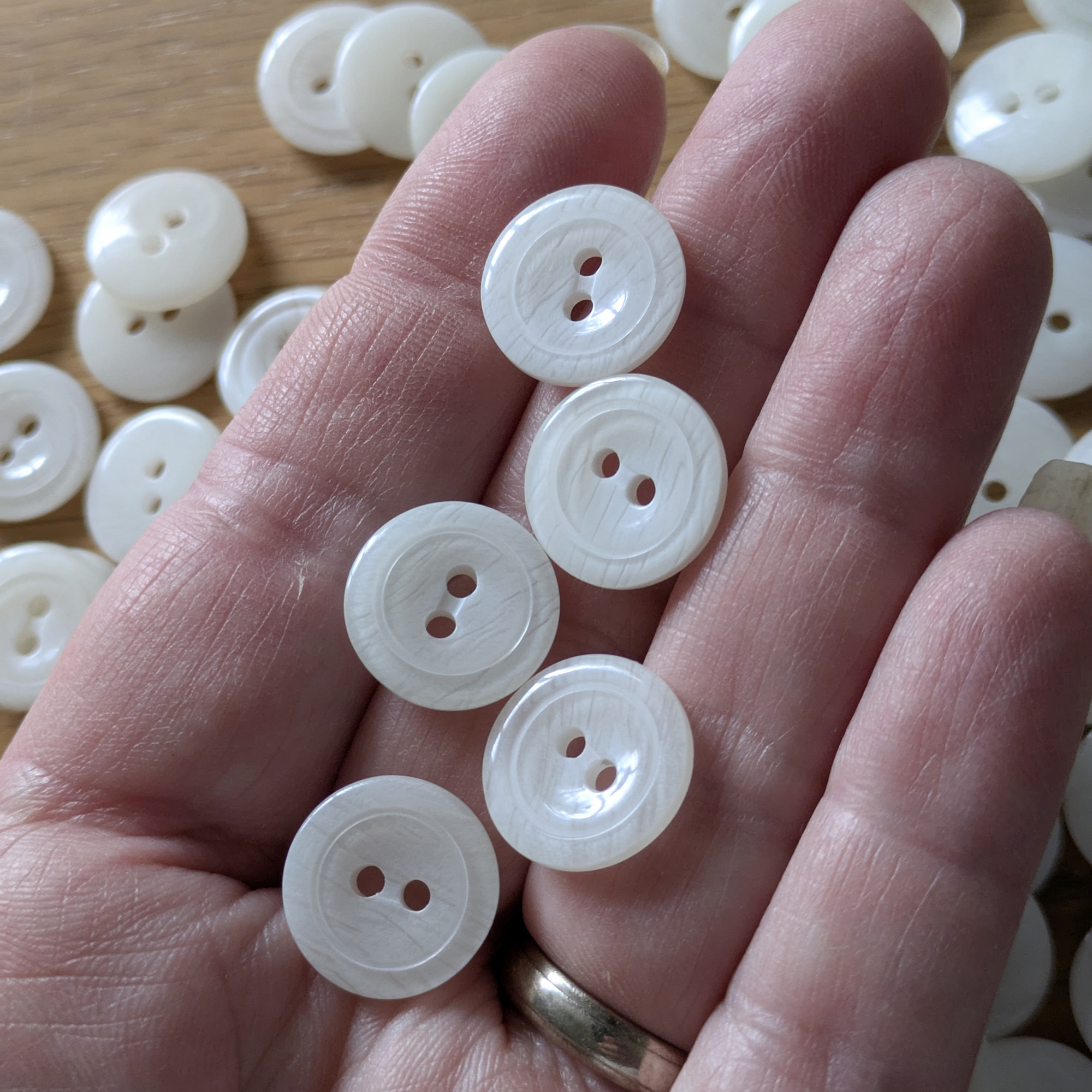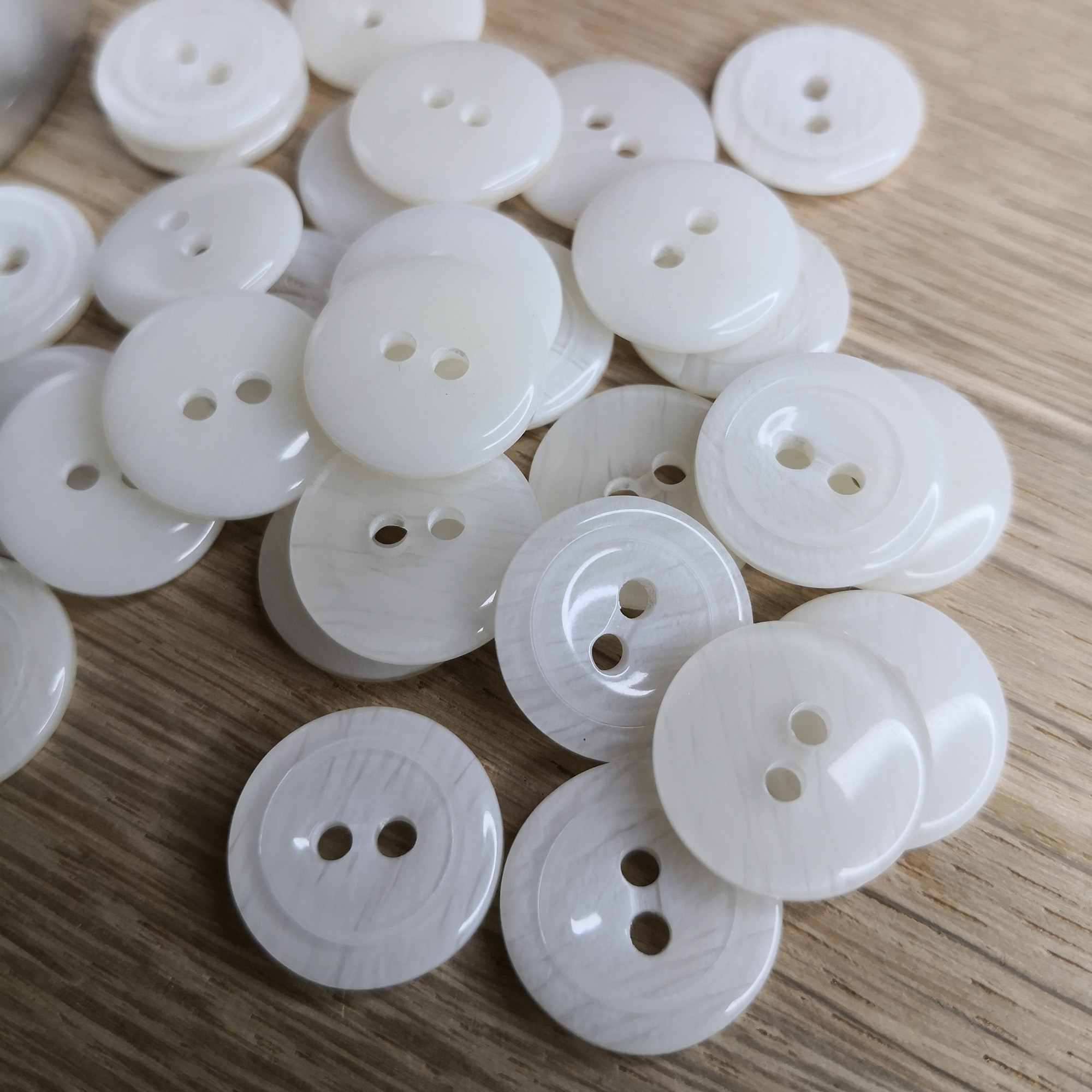 Add timeless elegance to your makes with these vintage white round buttons, featuring a fine line brushed pattern that creates a soft, organic texture across their off-white surface. Each 15 mm button has a slightly concave face with a raised ring edge, giving it subtle depth and classic vintage character.