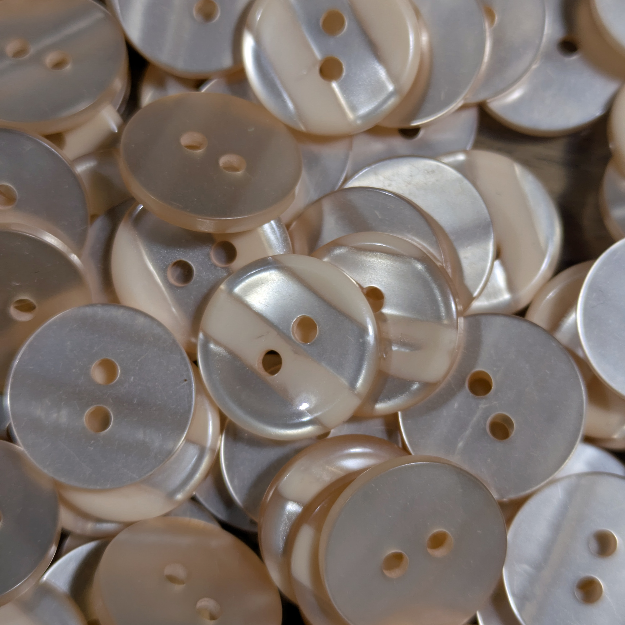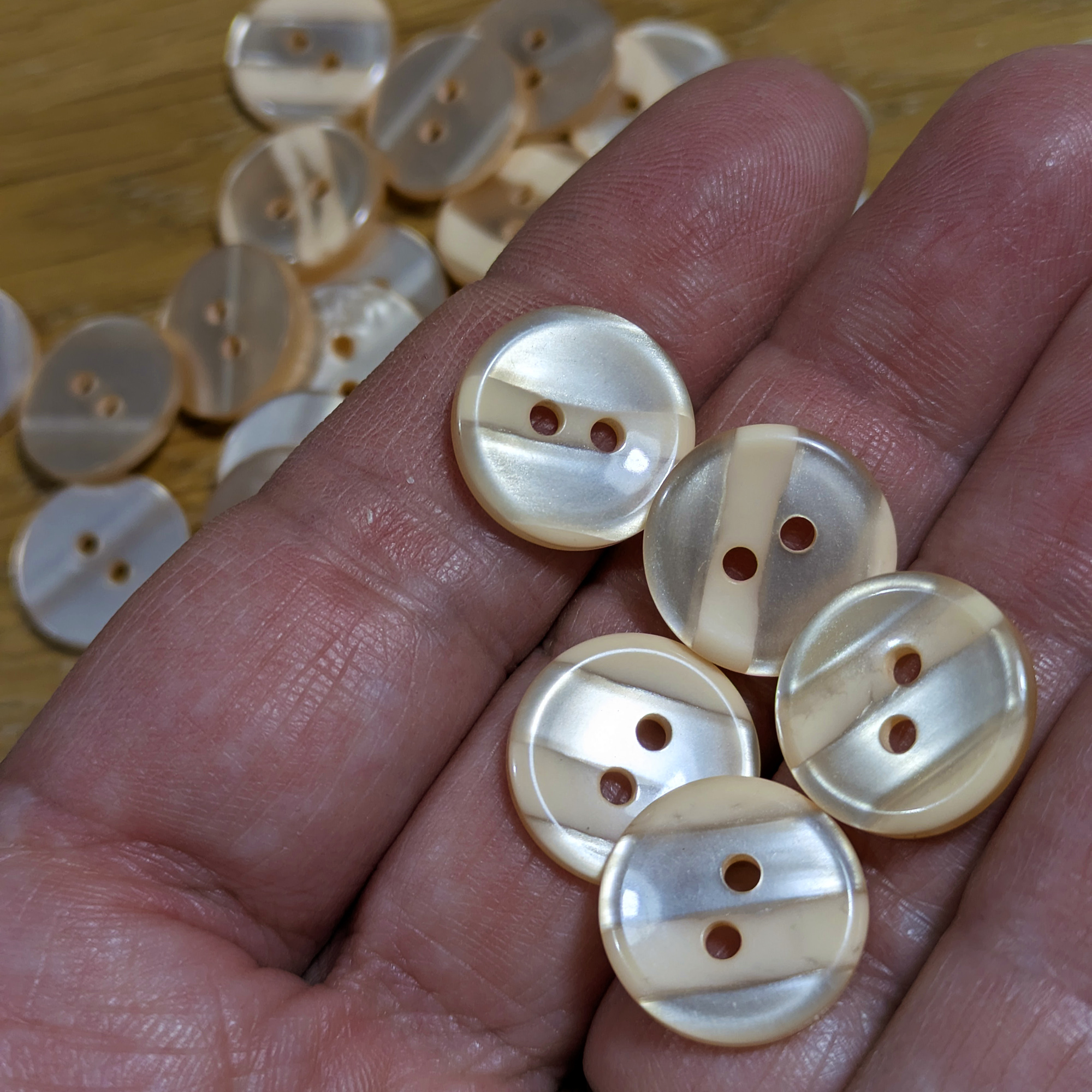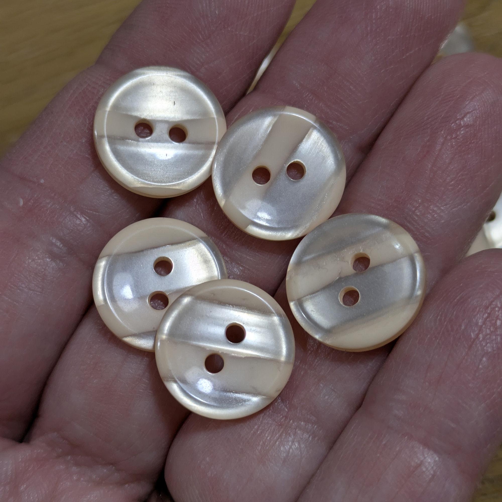 A set of 5 vintage-inspired sewing buttons featuring a subtle two-tone peach design with an opaque and clear brushed stripe pattern. The gentle colour variation and smooth finish make these buttons a lovely addition to any sewing or crafting project.