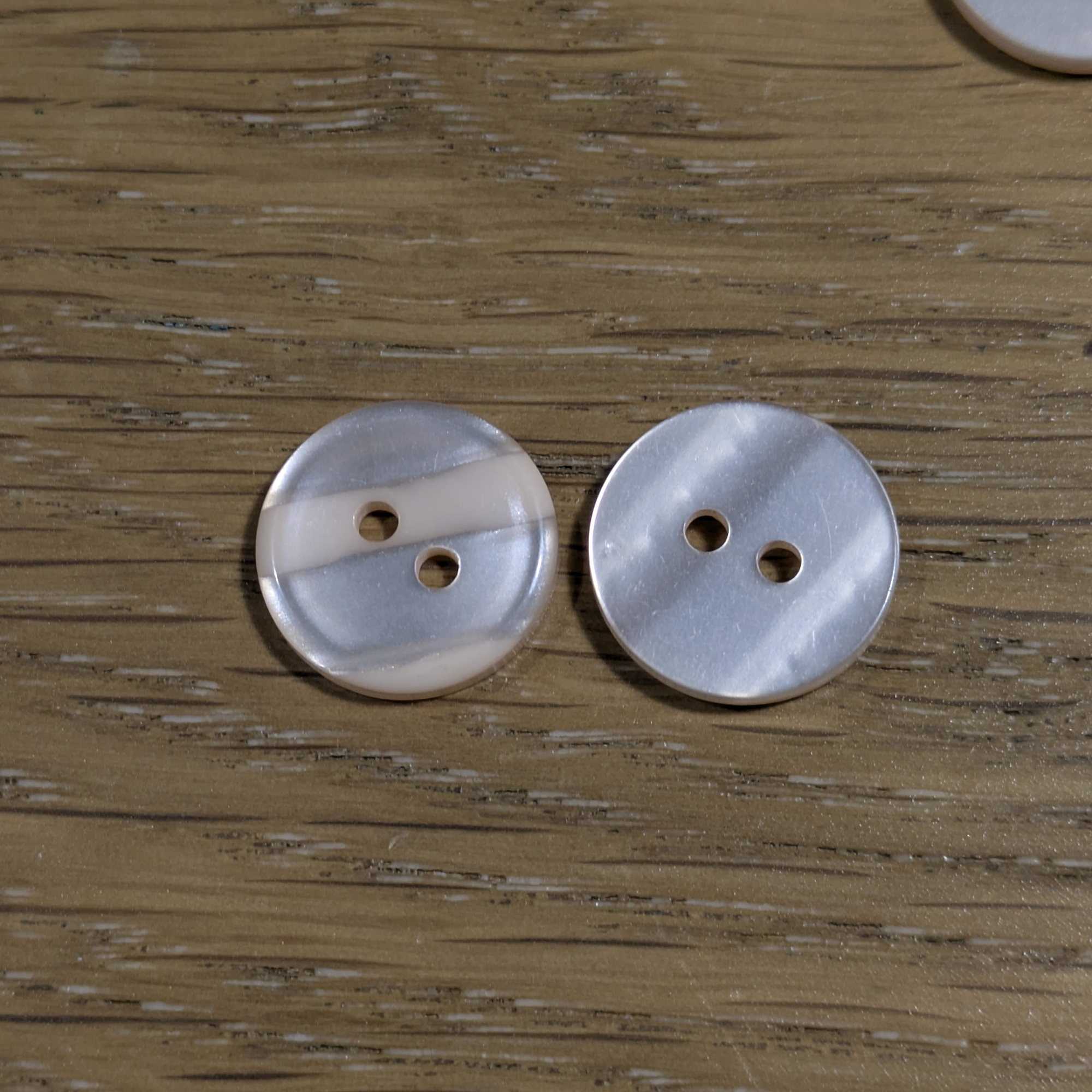Each button measures 15 mm and has a flat 2-hole design, making them easy to sew onto fabric. Their understated style complements both modern garments and vintage-inspired creations, adding a touch of soft colour and texture.