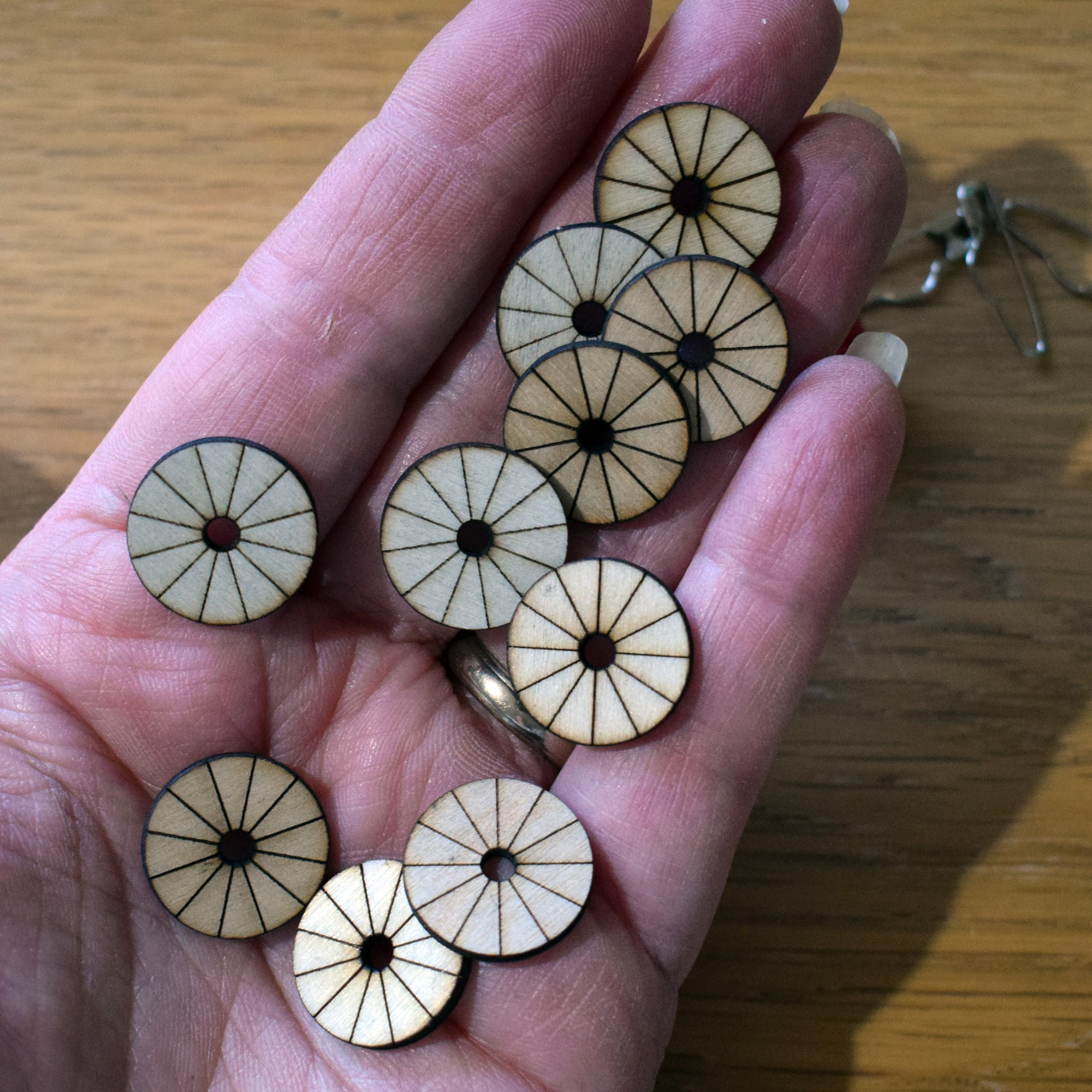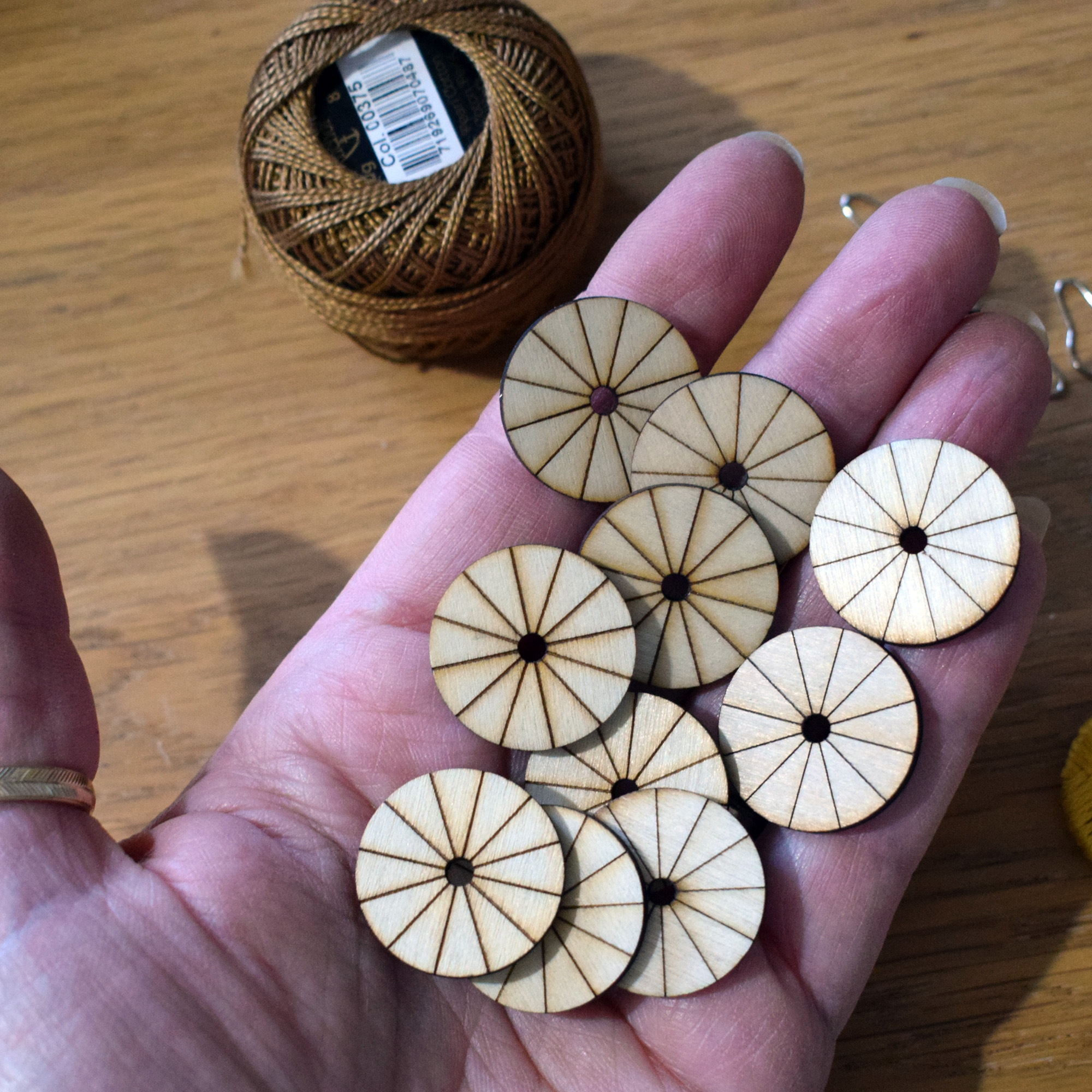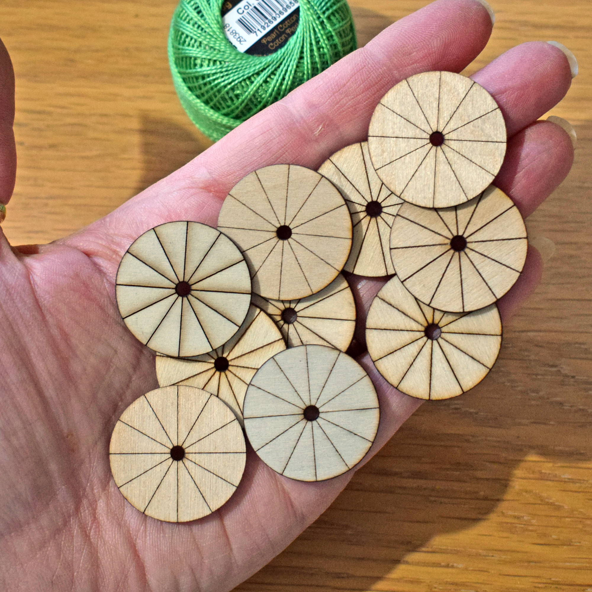 Set of ten flat birch plywood button moulds with engraved guide lines – perfect for thread-wrapped or fabric-covered handmade buttons.