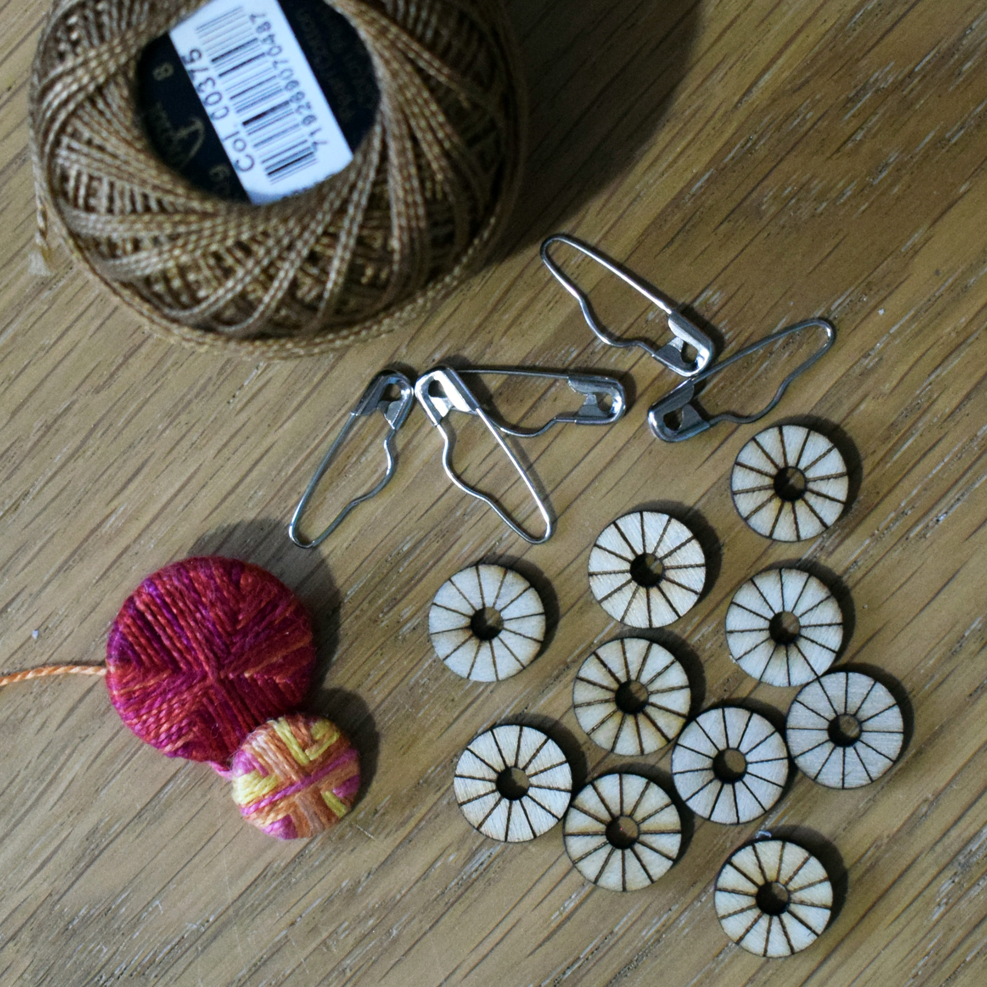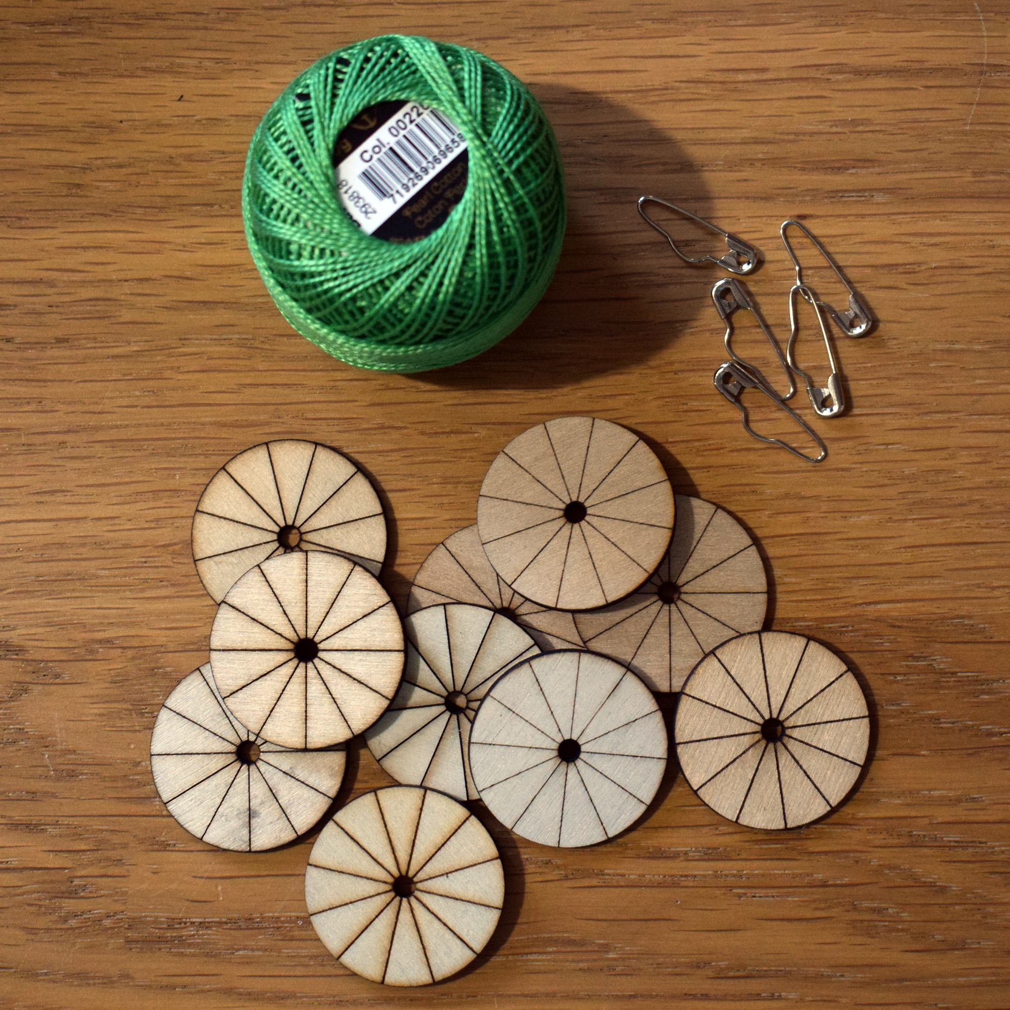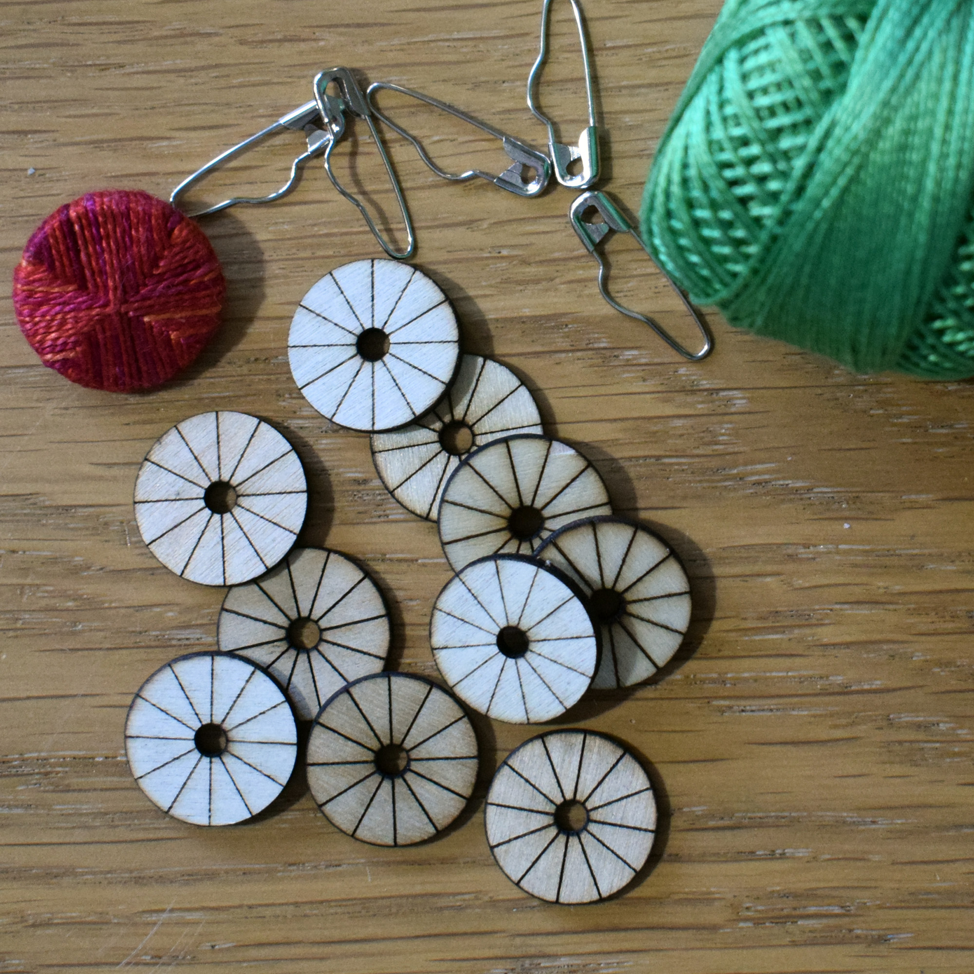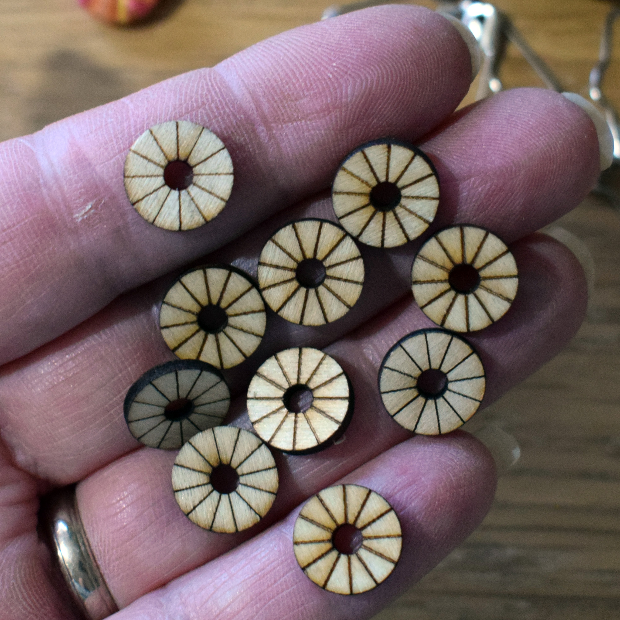 Set of ten flat birch plywood button moulds with engraved guide lines – perfect for thread-wrapped or fabric-covered handmade buttons.