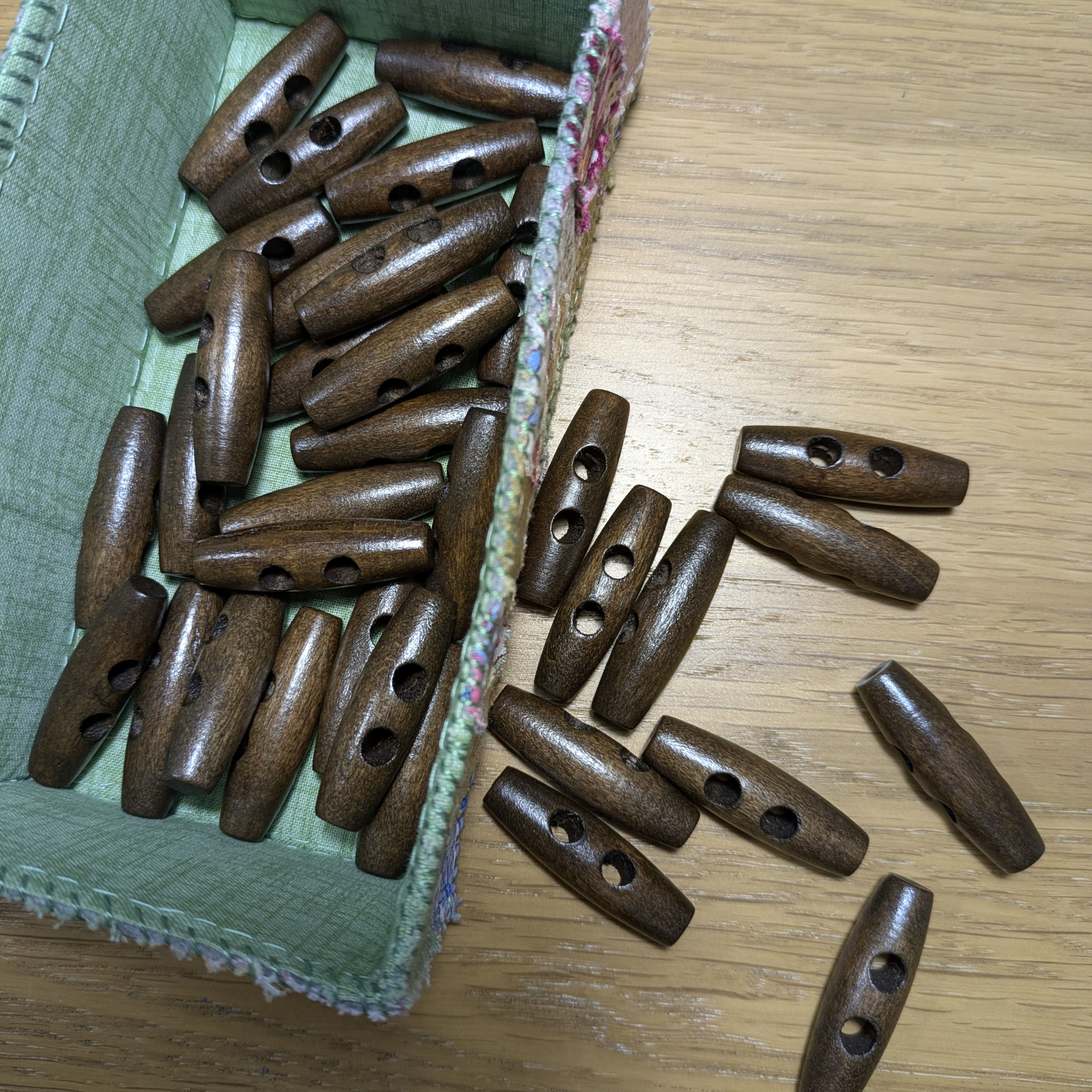 Also known as “walrus tusks” due to their classic curved shape, wooden toggles are a stylish alternative to regular buttons, adding both texture and rustic charm to handmade garments. This size is particularly suited to adult clothing such as duffle coats, cardigans, or chunky knits, while also lending a decorative touch to homeware projects like cushions, knitted baskets, or textile storage.