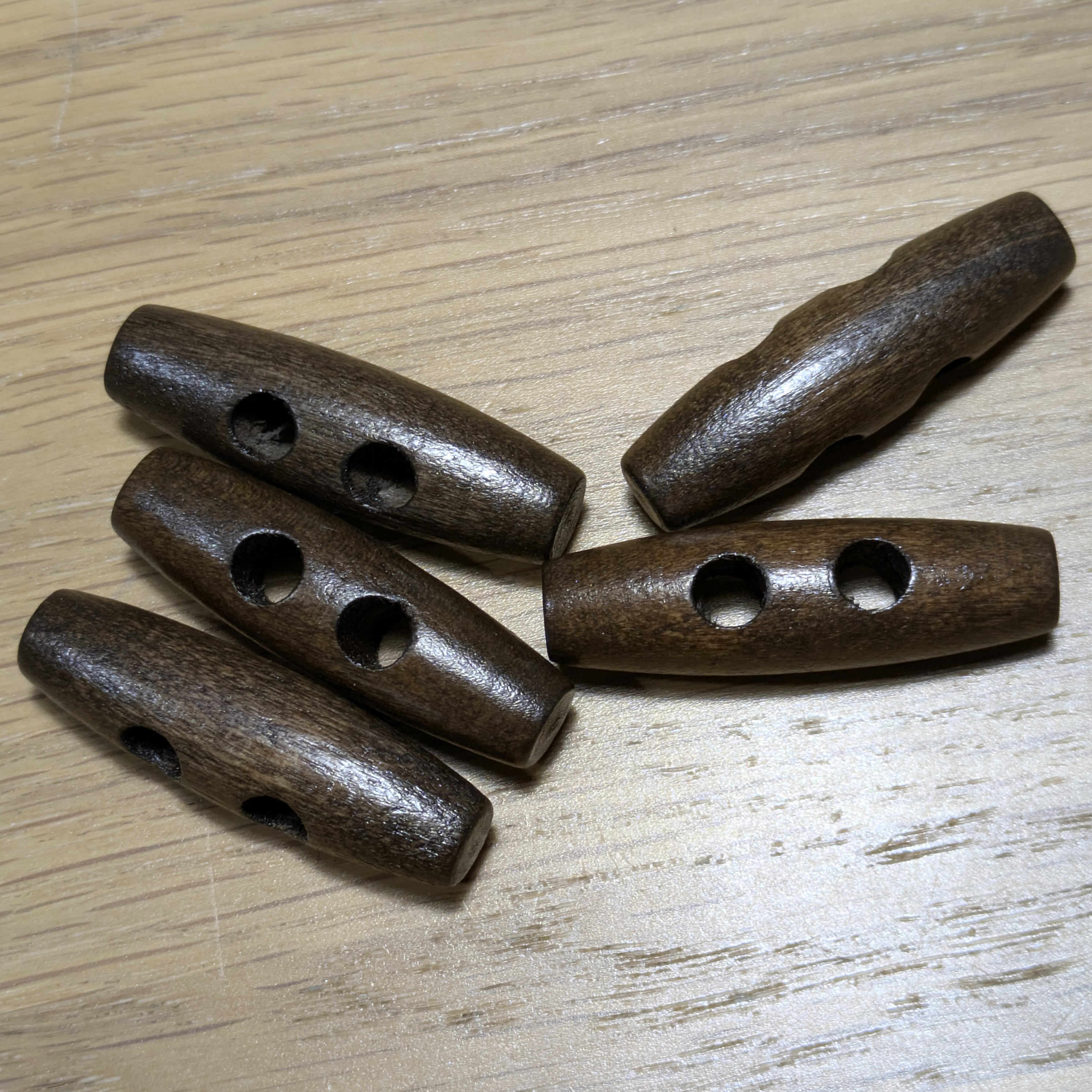 Set of five 40 mm smooth dark wooden toggles – classic fasteners for coats, knits, and stylish handmade accessories.